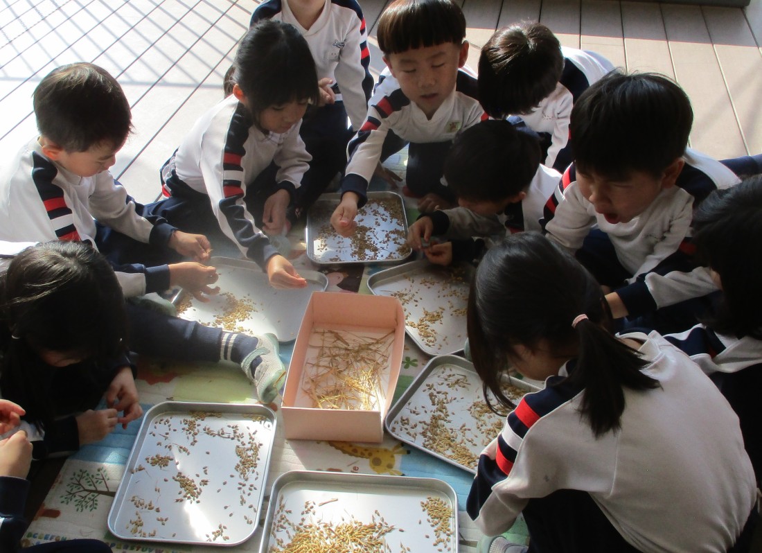 5歳児つき組が、脱穀されたお米を一粒一粒外していきました。やってもやってもなかなか減っ ...