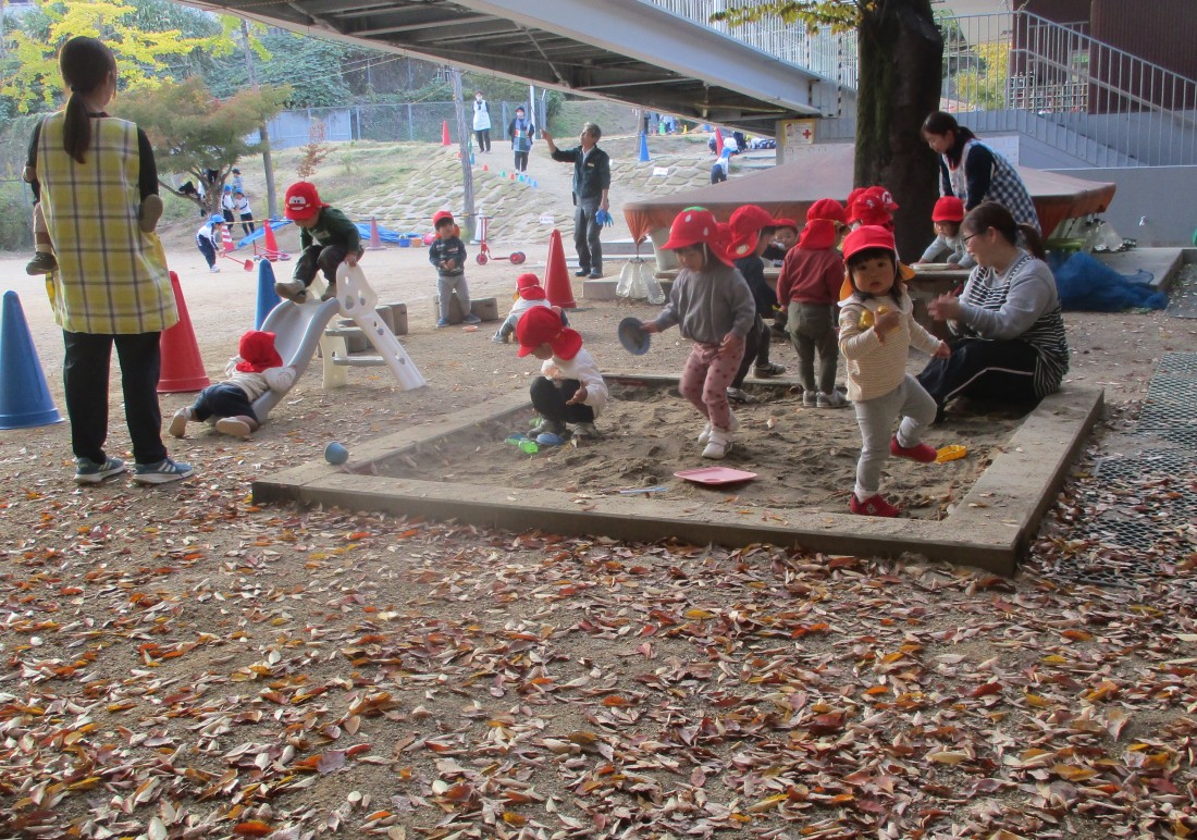 1歳児いちご組さんが、欅の落ち葉が敷き詰められた新しい乳児園庭で遊びました。先生と一緒 ...