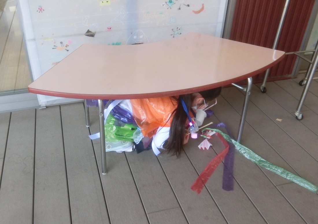 保育室で遊んでいた乳児さんも、さっと先生たちのそばによって、ダンゴムシのポーズをとって避難します。