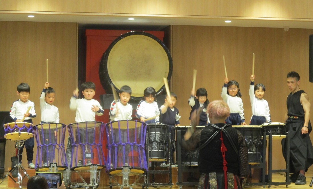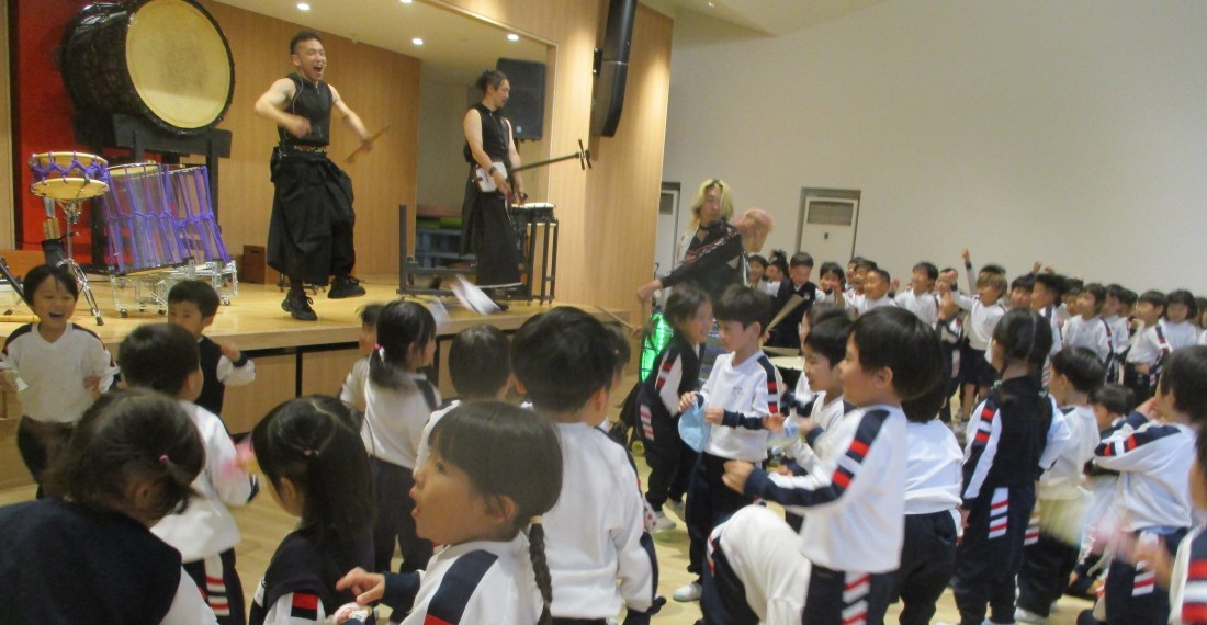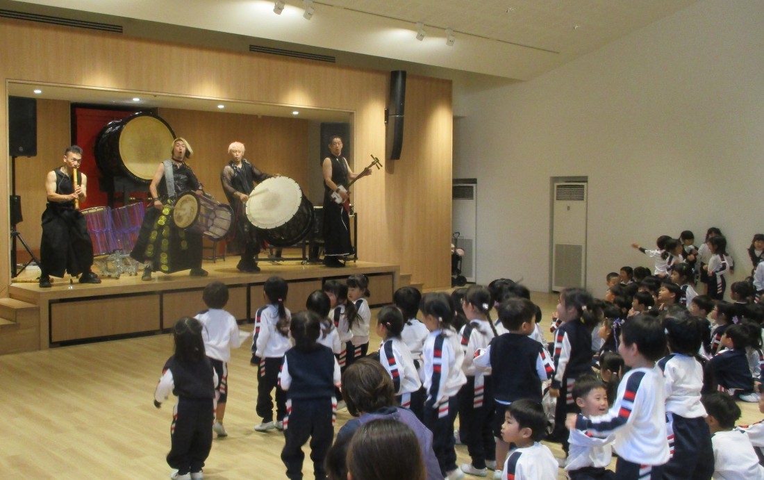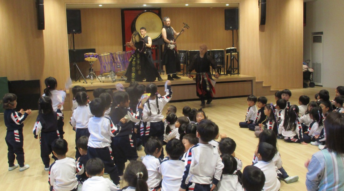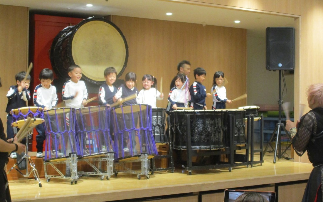後半はますます盛り上がり、立ち上がって自分の小さなタオルを振ったり、手拍子したり、リズムに合わせてジャンプしたりと、まるでライブ会場のような熱気でした。日本古来の和楽器の、大迫力ある素晴らしい演奏や掛け声、子ども達への優しい言葉がけ。太鼓もたたかせていただき貴重な経験をした子どもたちです。後援会様、TRAinnovationの皆様、有難うございました。