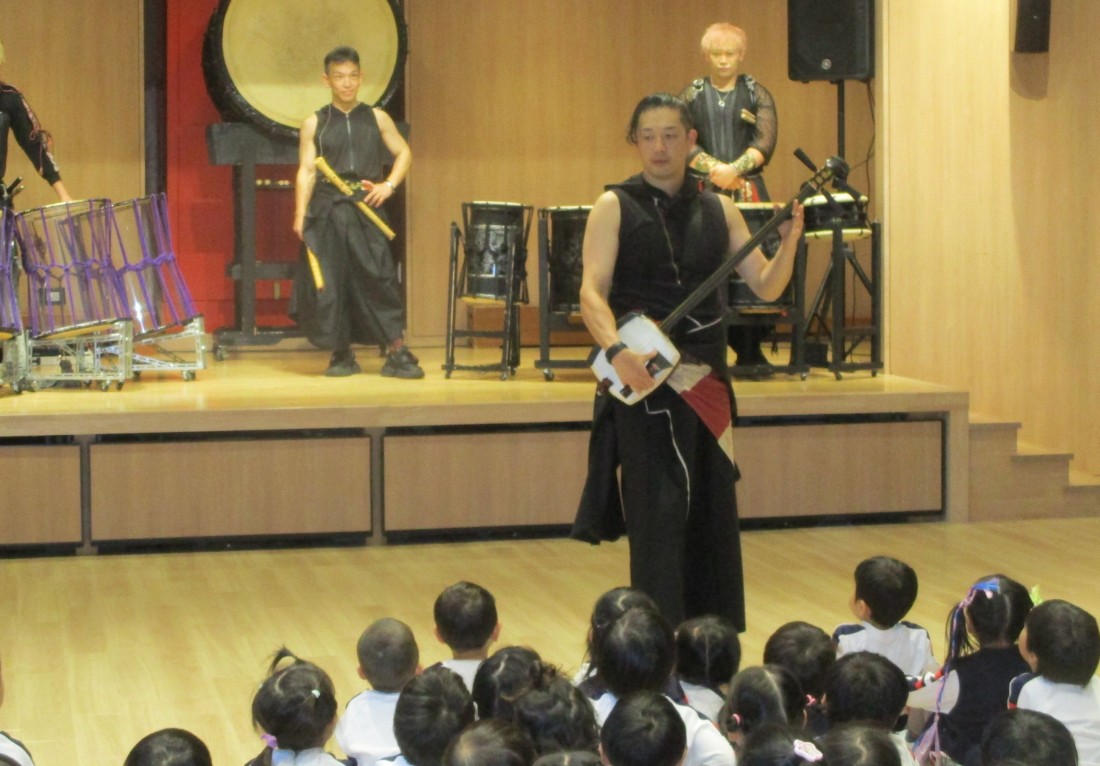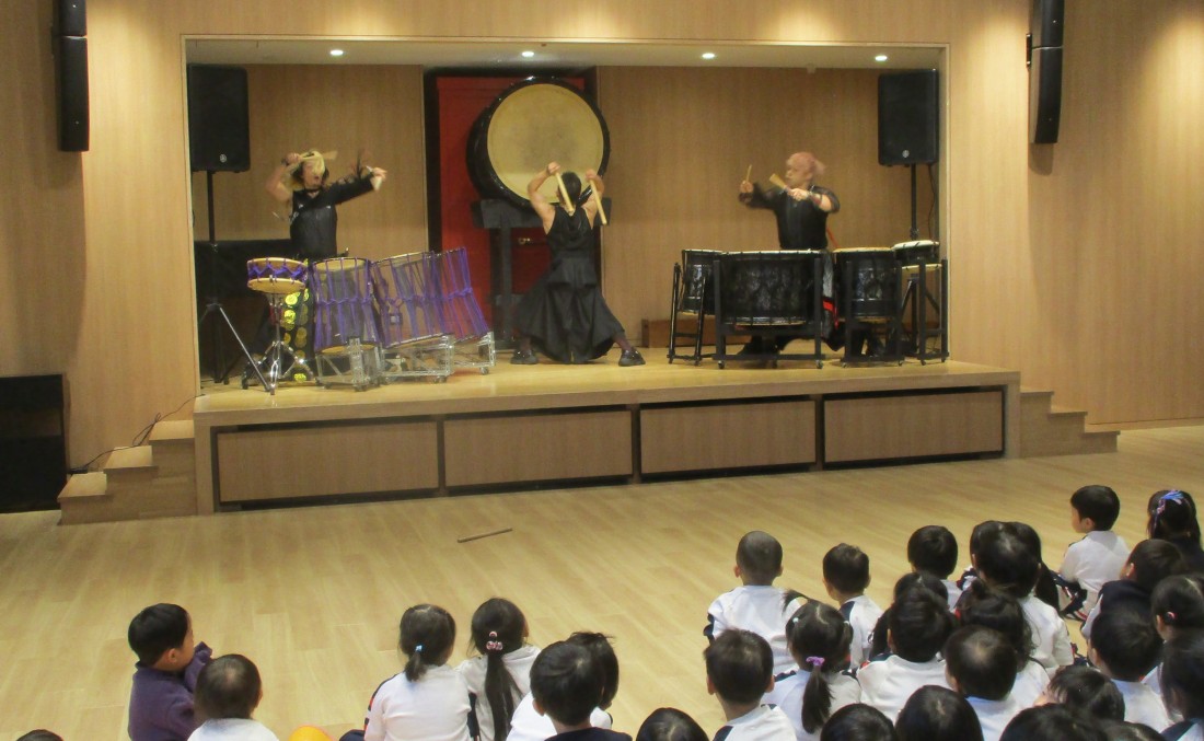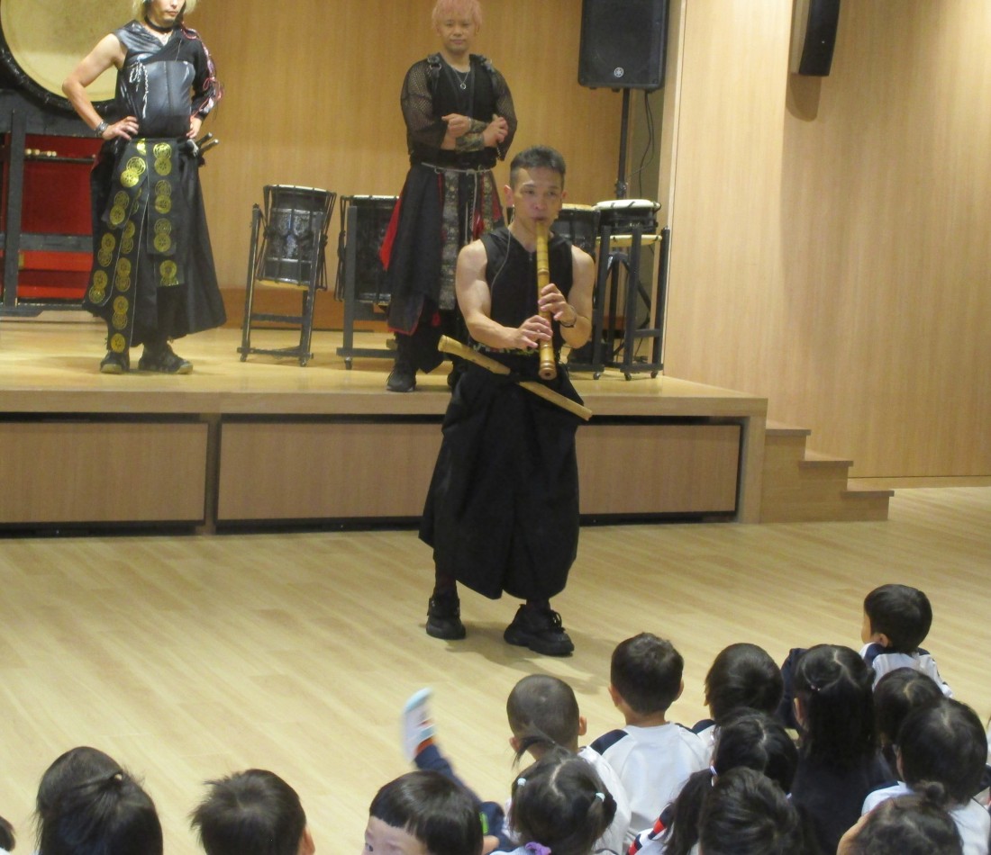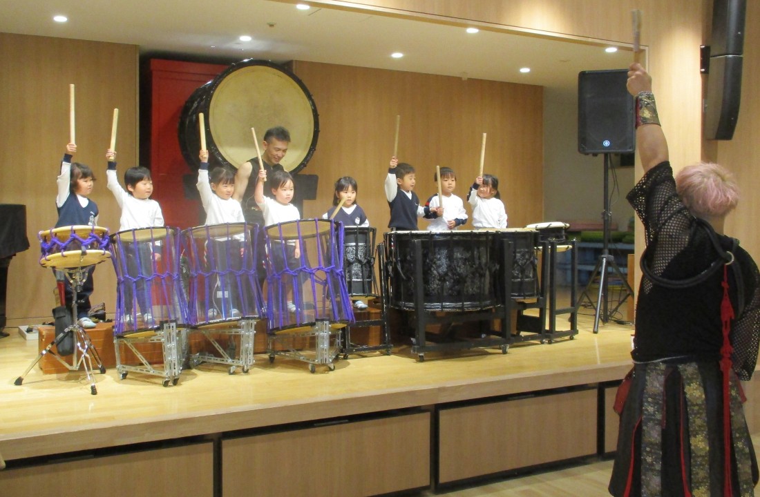 後半はますます盛り上がり、立ち上がって自分の小さなタオルを振ったり、手拍子したり、リズムに合わせてジャンプしたりと、まるでライブ会場のような熱気でした。日本古来の和楽器の、大迫力ある素晴らしい演奏や掛け声、子ども達への優しい言葉がけ。太鼓もたたかせていただき貴重な経験をした子どもたちです。後援会様、TRAinnovationの皆様、有難うございました。