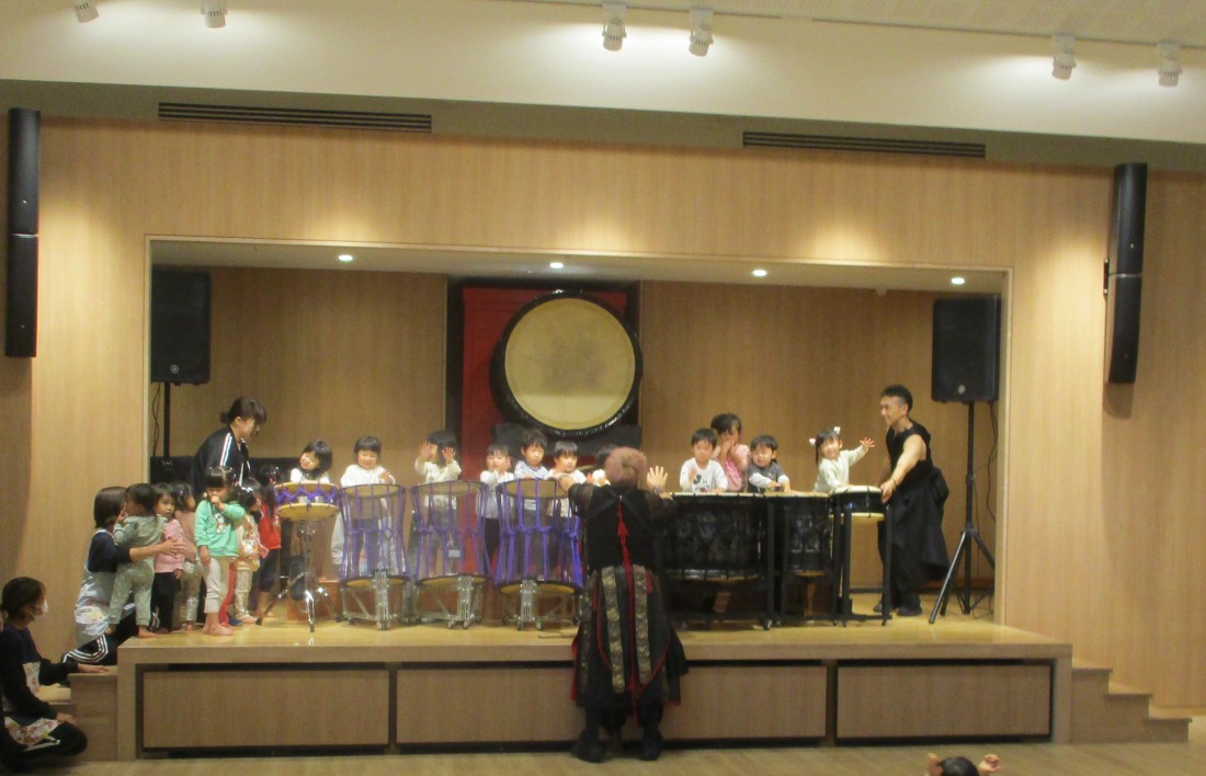 次に太鼓をたたくのは子どもたち!全園児が順番に舞台に上がり、太鼓をたたかせてもらいました。乳児は素手で、幼児はメンバーの方の合図に合わせてバチを振り上げ、力強く太鼓をたたく心地よさと醍醐味を味わっていました。