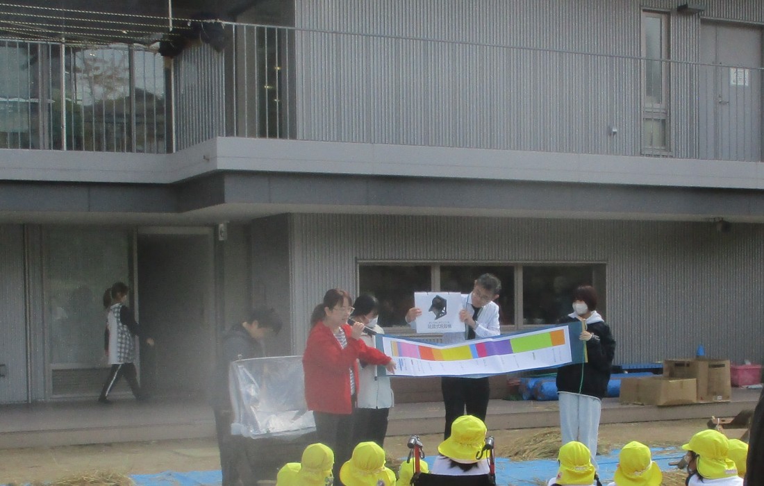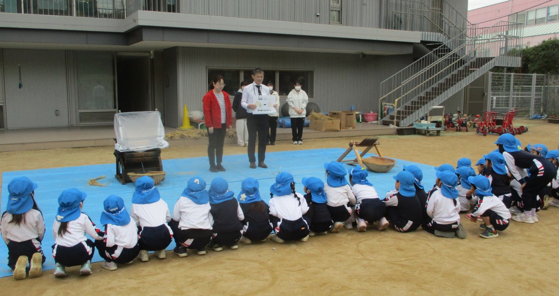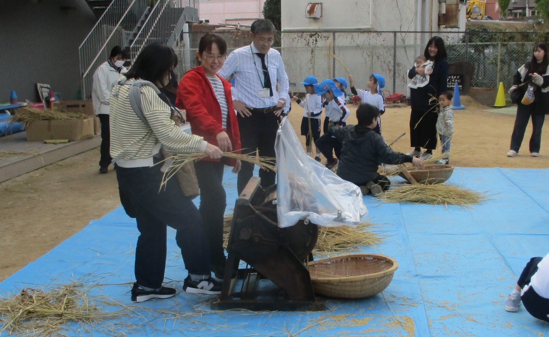 今日は5歳児が、種から育ててきたお米の脱穀を行いました。河内長野のふるさと歴史学習館から、昔の農具をもって3人の指導員さんが来てくださいました。今回は保護者の方に自由見学してもらいました。