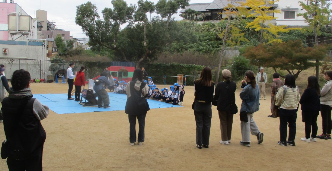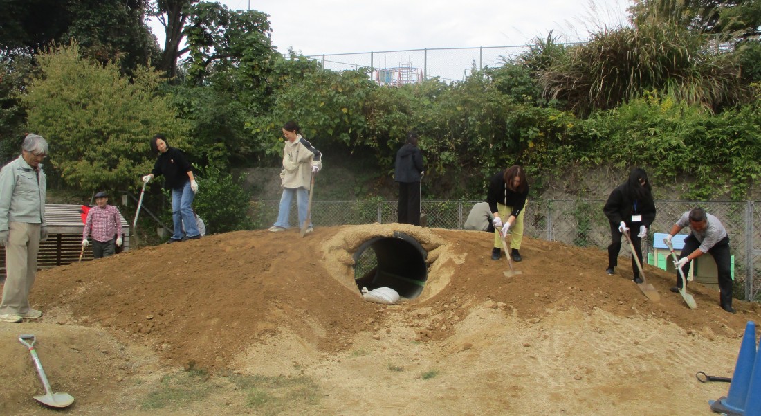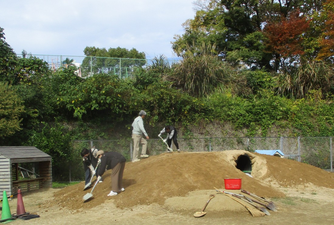 各クラスの見学の前後に、園庭改修工事にも参加していただき、築山の傾斜を緩やかにする作業をしていただきました。