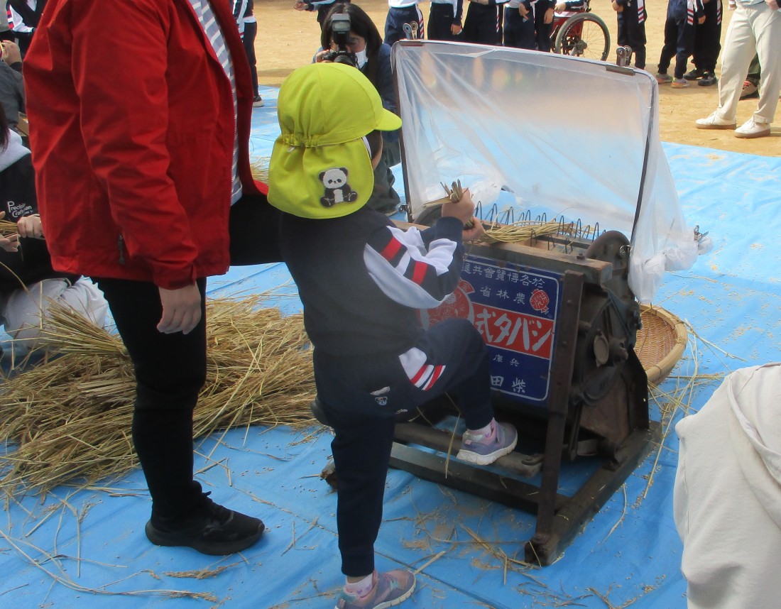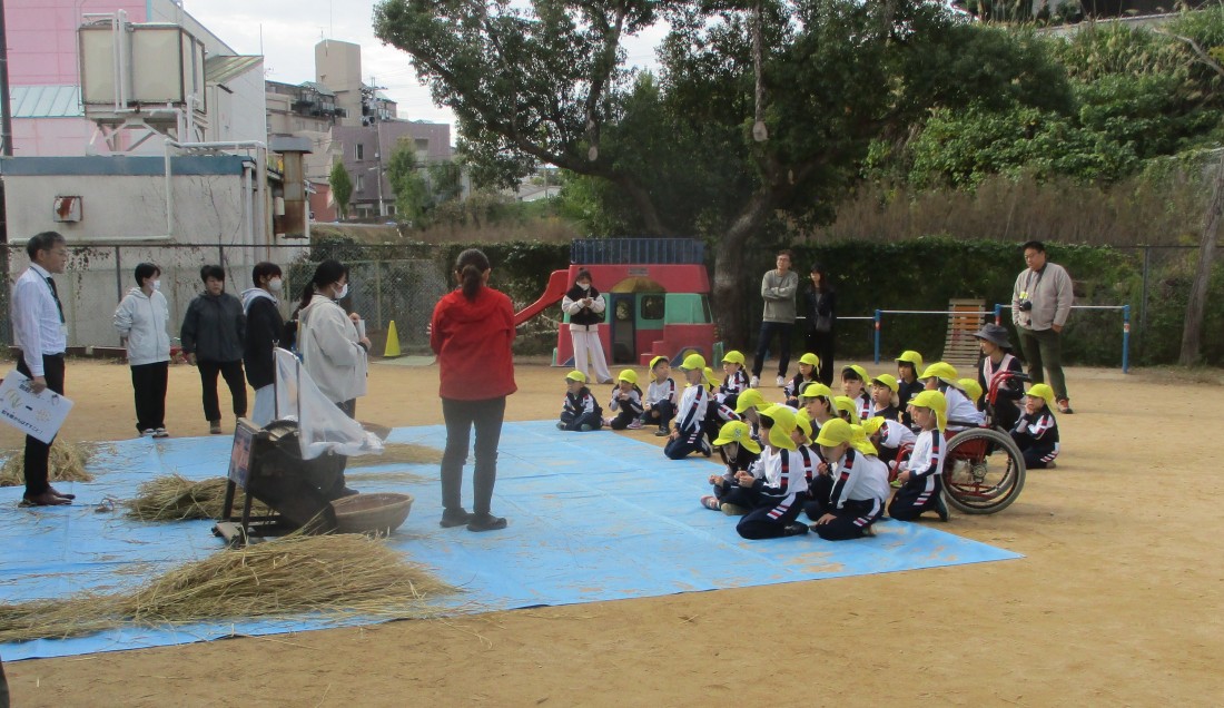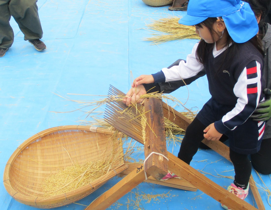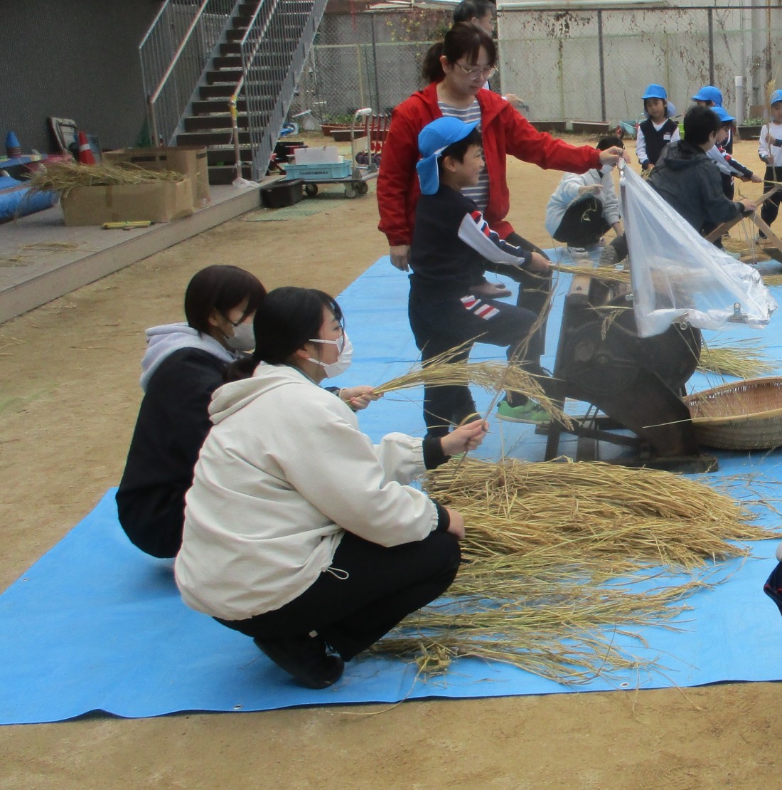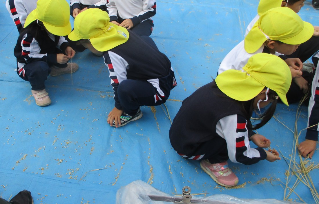 昔からずっと続いているお米つくり。長い歴史の中で進化していく様々な伝統農具を使って脱穀するという貴重な体験をした子どもたち。お部屋での振り返りでは「面白かった!」「ビリビリって外すのがかわいそうだった!」「感謝の気持ちを込める・・」 春からのお米つくりの継続した経験から深まりを感じる子どもたちの言葉でした。ふるさと歴史学習館の皆様、大阪大谷大学の学生さん、改修工事をご指導いただいた瀬口さん、ありがとうございました。