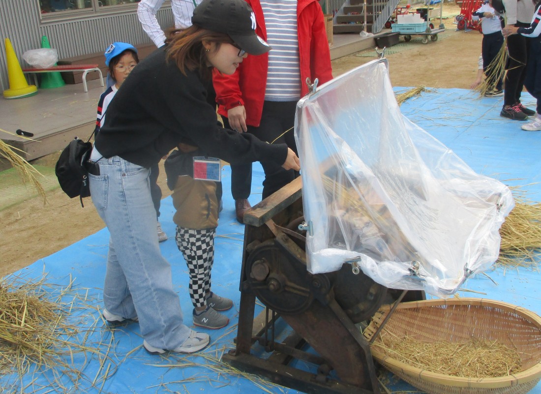 大正時代の「足ふみ脱穀機」です。足でペダルを踏むと葉がついたドラムが回転して、ポロポロと穂が外れます。みんながどちらも体験しました。