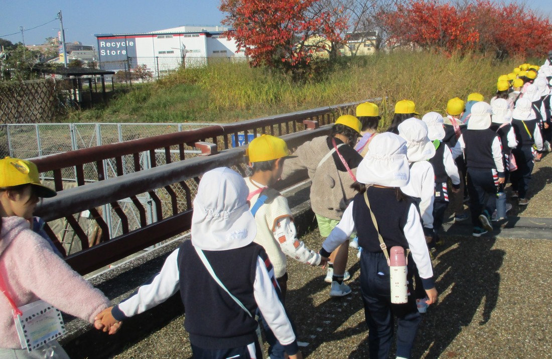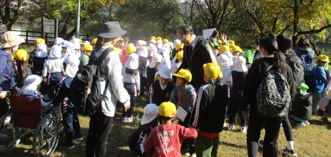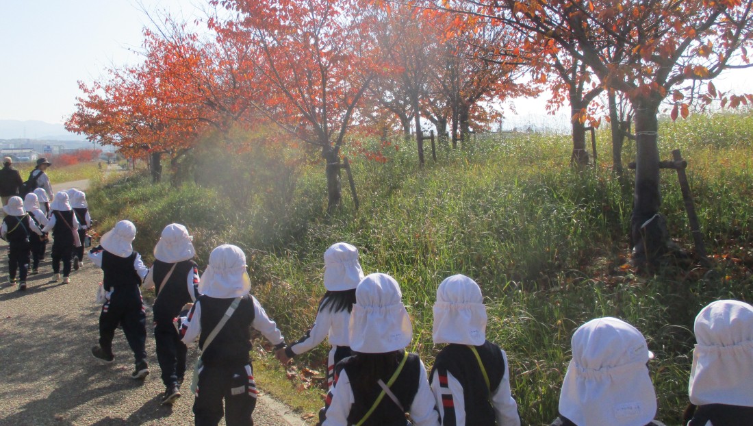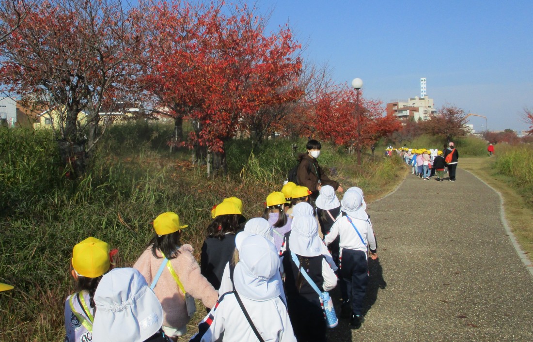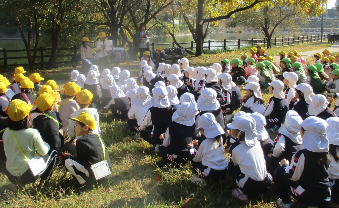 紅葉した遊歩道を歩きながら狭山池の秋と1年生の兄ちゃんお姉ちゃんの優しさを感じ、少し遠い副池までみんなで歩きました。副池では楽しい交流をいっぱい楽しみました。帰りは汗ばむ陽気の中どんぐりがたくさん入った小学生手作りの袋を大事そうに持ちながら園を目指して歩きました。西小学校1年生のみなさん、ありがとうございました。