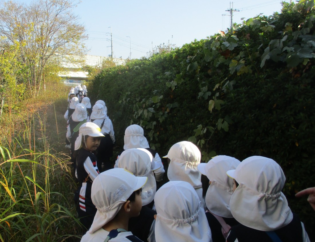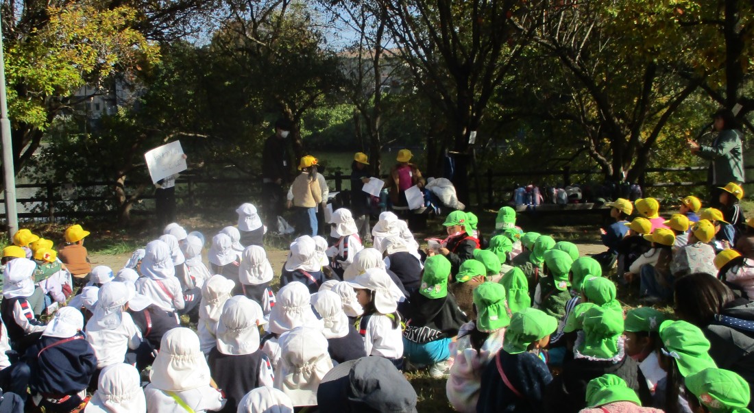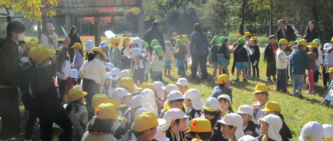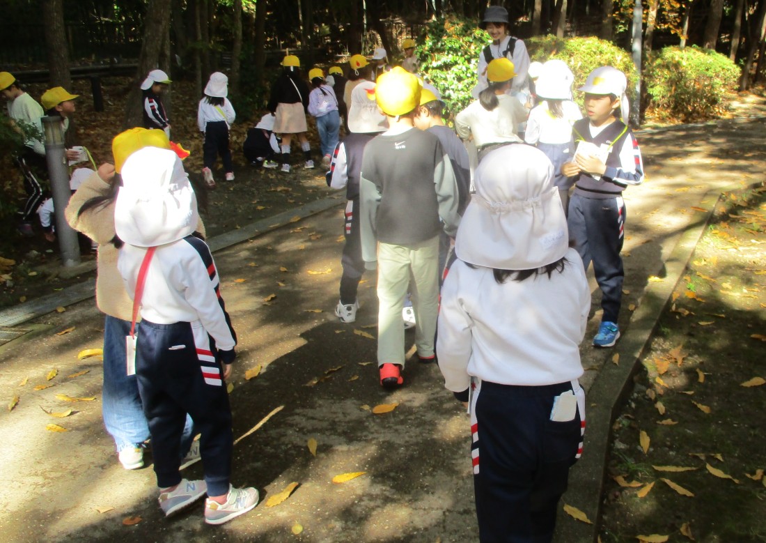 紅葉した遊歩道を歩きながら狭山池の秋と1年生の兄ちゃんお姉ちゃんの優しさを感じ、少し遠い副池までみんなで歩きました。副池では楽しい交流をいっぱい楽しみました。帰りは汗ばむ陽気の中どんぐりがたくさん入った小学生手作りの袋を大事そうに持ちながら園を目指して歩きました。西小学校1年生のみなさん、ありがとうございました。