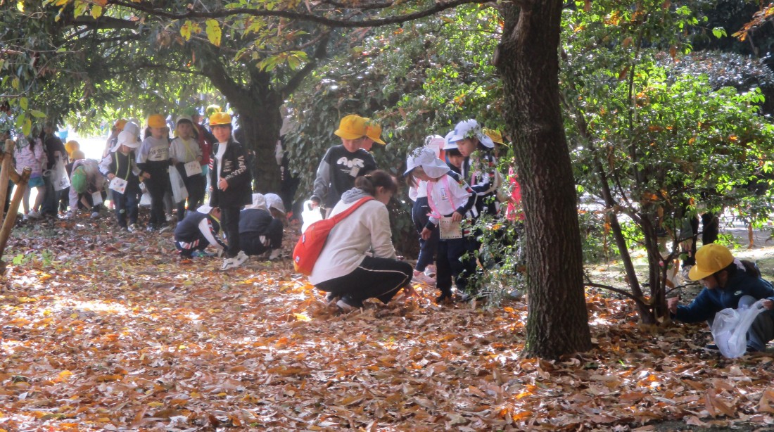 落ち葉を踏みしめ、「こっちにいっぱいあるよ!」「こっちのは丸くて大きいよ!」と言葉を掛け合いながらグループの小学生とどんぐりを集めて袋に入れます。