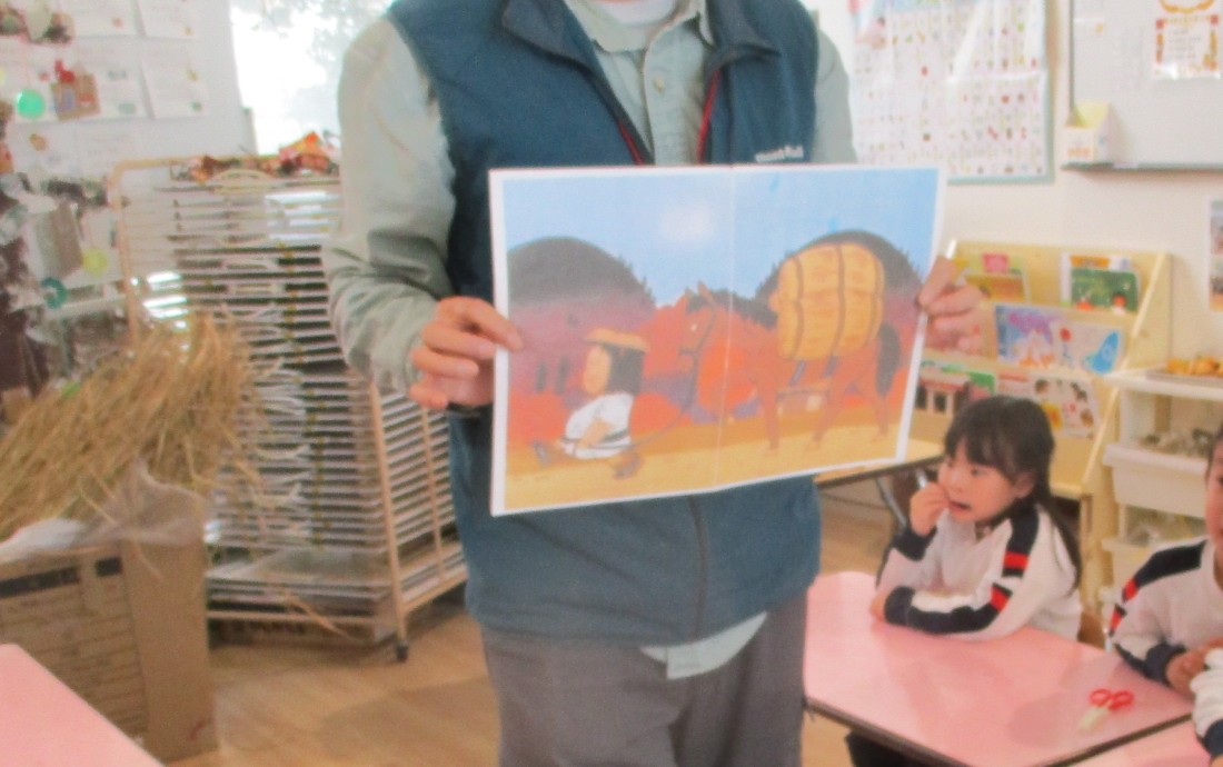 わら細工の前に、わらのお話です。わらでできているものや昔話の絵の中に出てくる写真を見せていただきました。