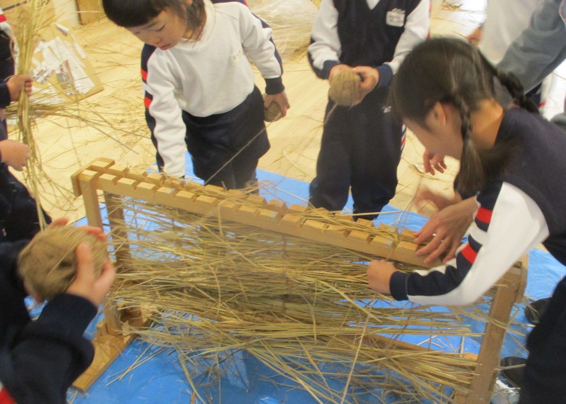麻ひもをかけう・わらをのせる・わらを整える・麻ひもをかける・・・声を掛け合い、気持ちを合わせて編んでいきます。初めはひもを見失ったり、うまく交換できなかったりとなかなか進みませんでしたが、繰り返すなかでコモが長くなってきて、楽しくなっていきました。