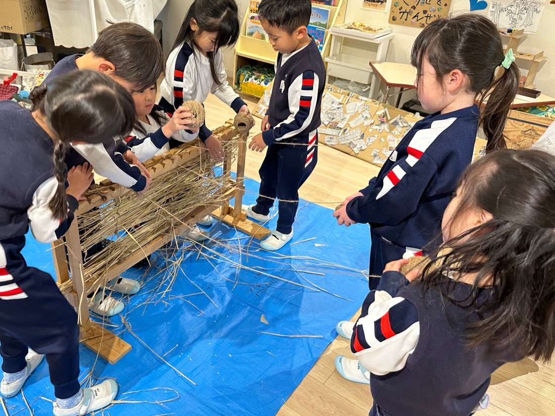 5歳児つき組が「こも編み」に挑戦しています。他園からこも編みの農具を貸していただいています。「こも」とは寒い地方の雪囲いで樹木に巻くむしろのことです。