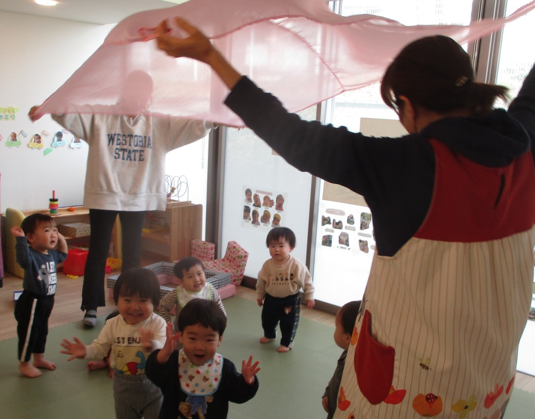昨日の乳児さん。0歳児もも組は、お部屋で「おおかぜこい」のわらべ歌を楽しんだ後、遊戯室でいっぱい遊びました。