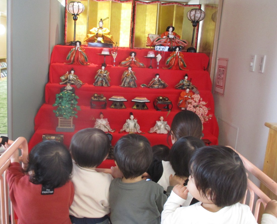 遊戯室からお部屋に戻る時、図書室に飾られたお雛様をみんなで見ました。先生たちが口ずさむ ♪うれしいひなまつり♪ も聞いていた子どもたちでした。