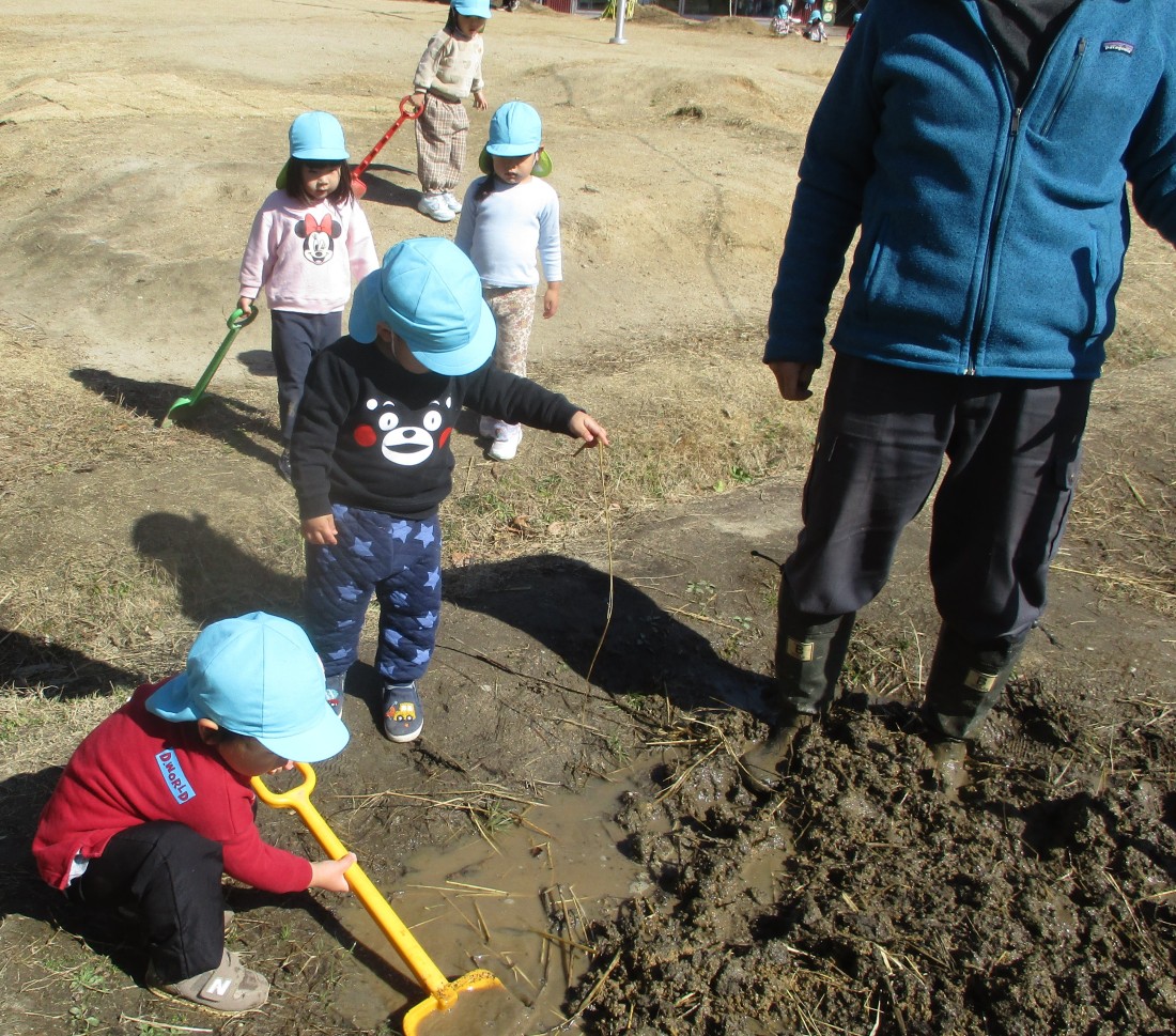 温かいお昼前、いつもは5歳児が活動する田んぼで「ぼくもこんなことができるよ!」「先生が持っているのを使いたいな!」「カエル出てこないかな!」何度も何度ものぞきに来ては、お米隊長を真似ようとするぶどうさんたちでした。3年後、あなたたちがここでお米つくりをするんだよ・・。