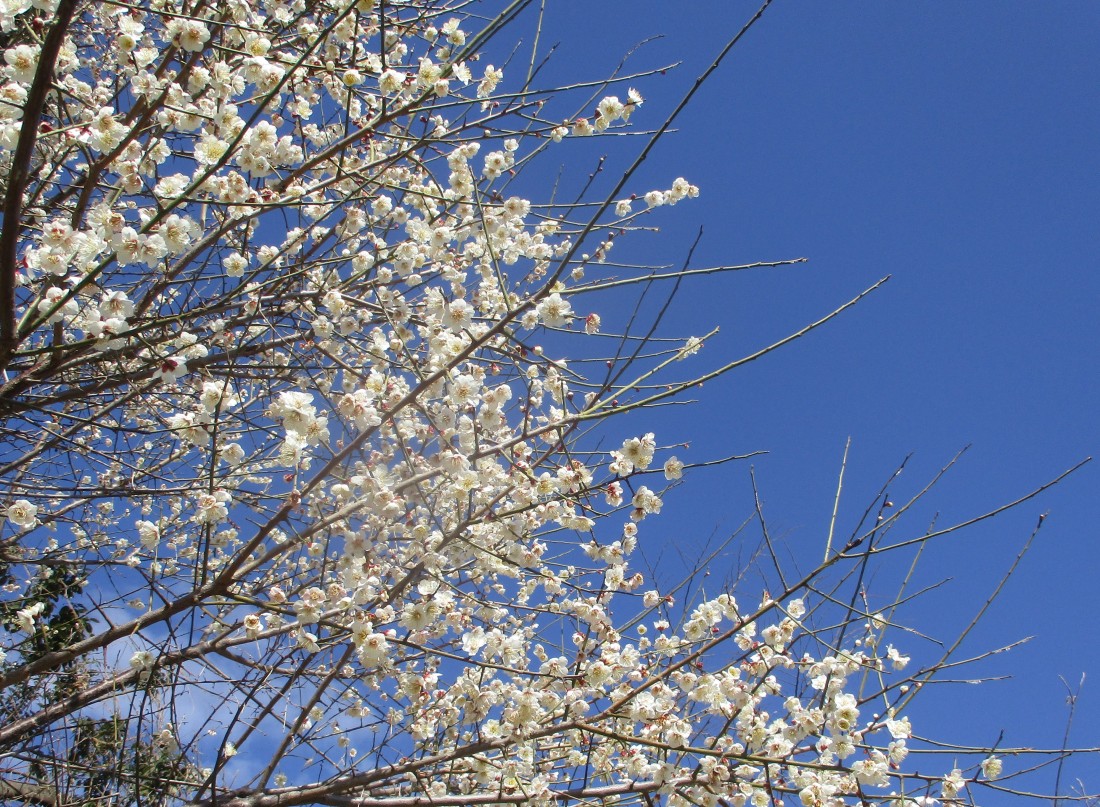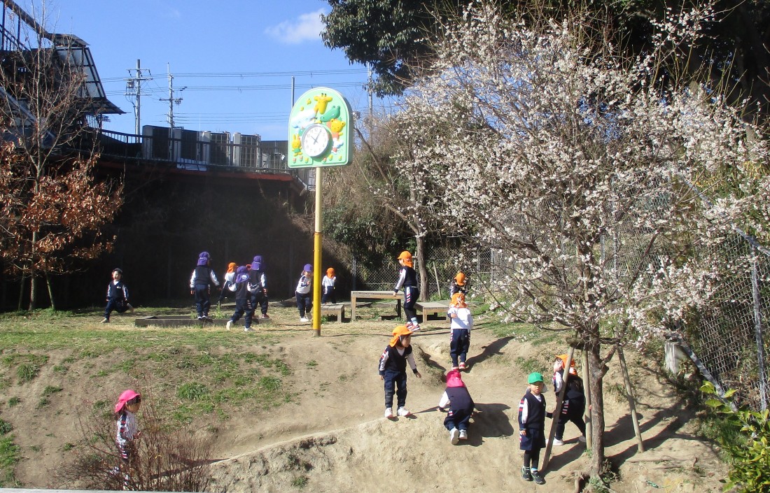 第4園庭の満開の白梅のふもとで遊ぶ子どもたち。