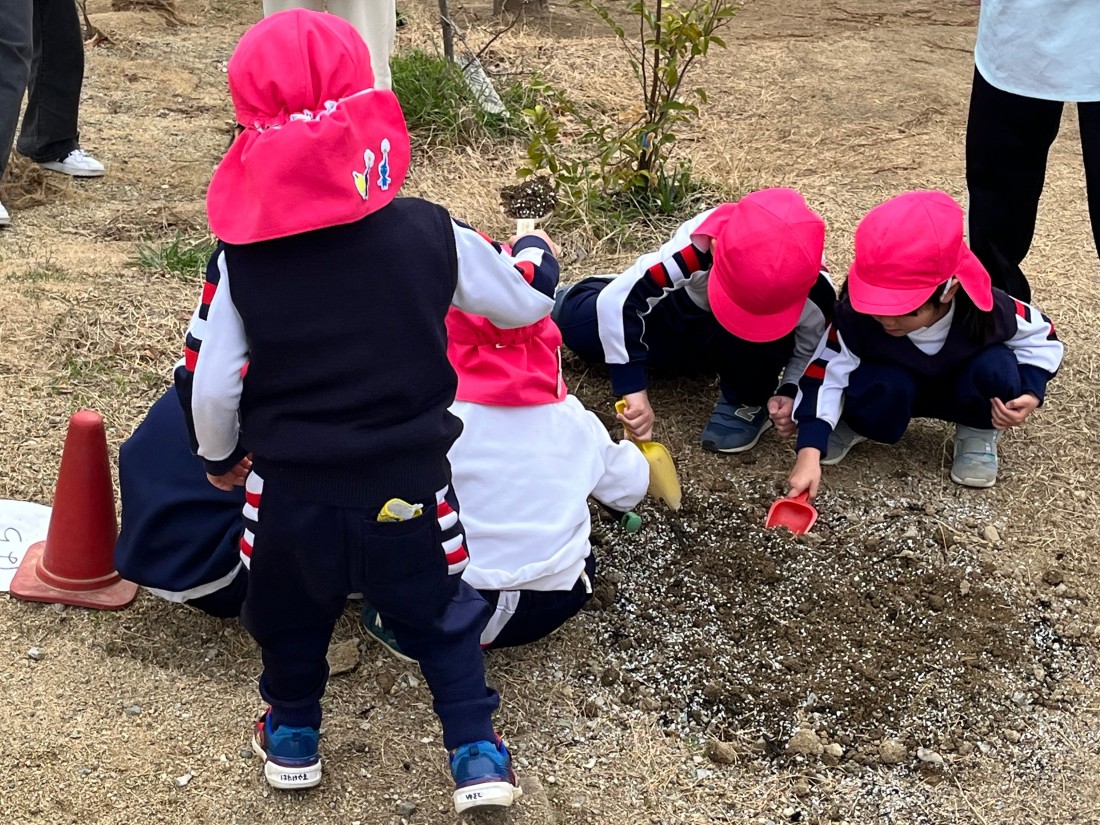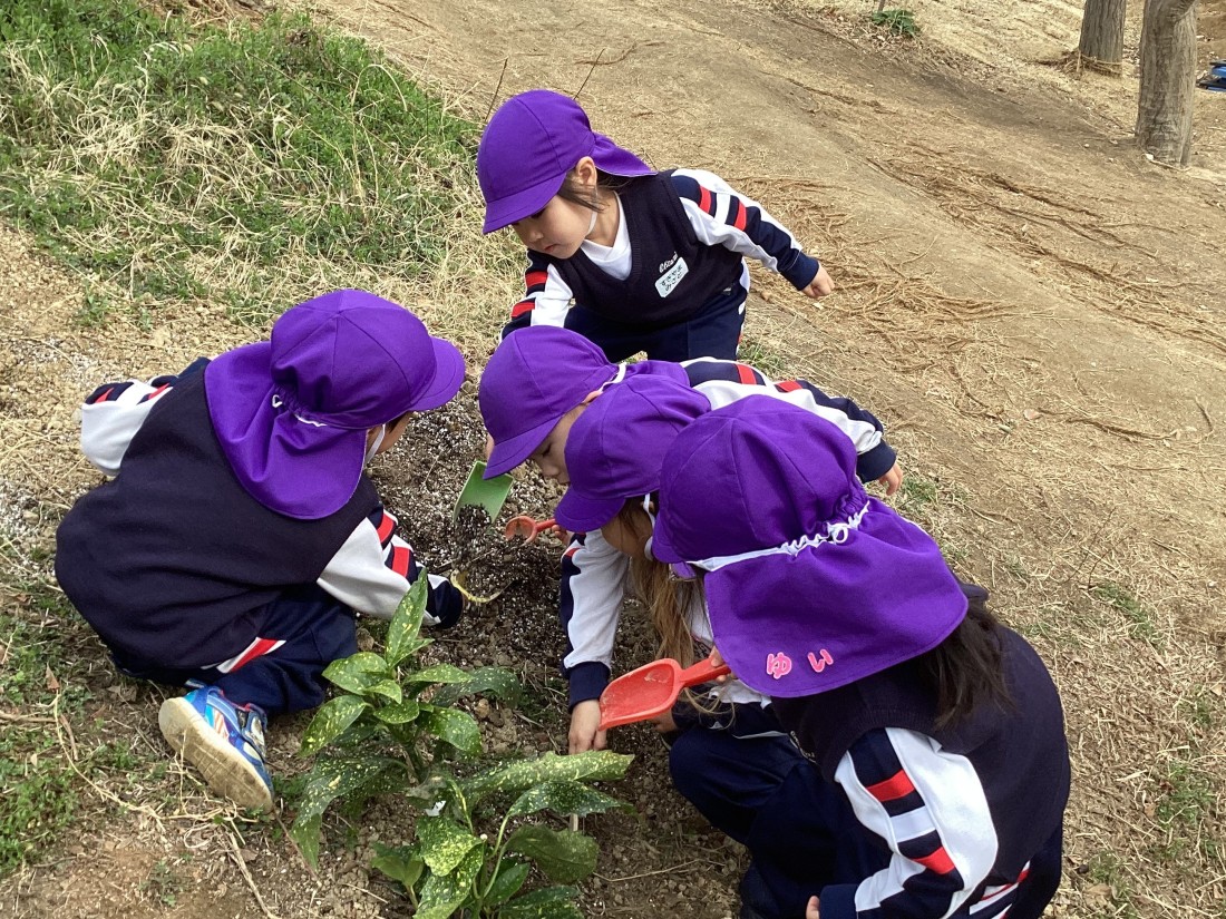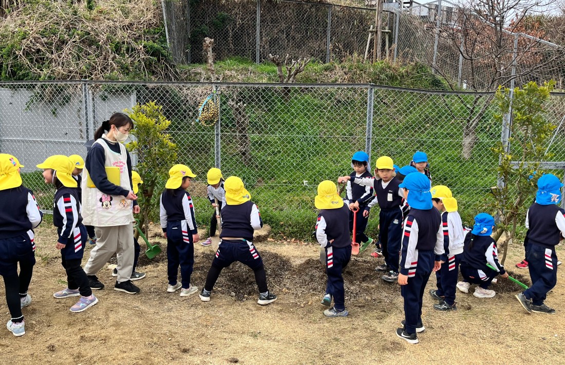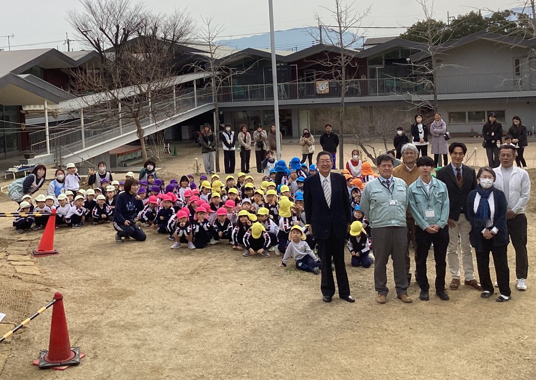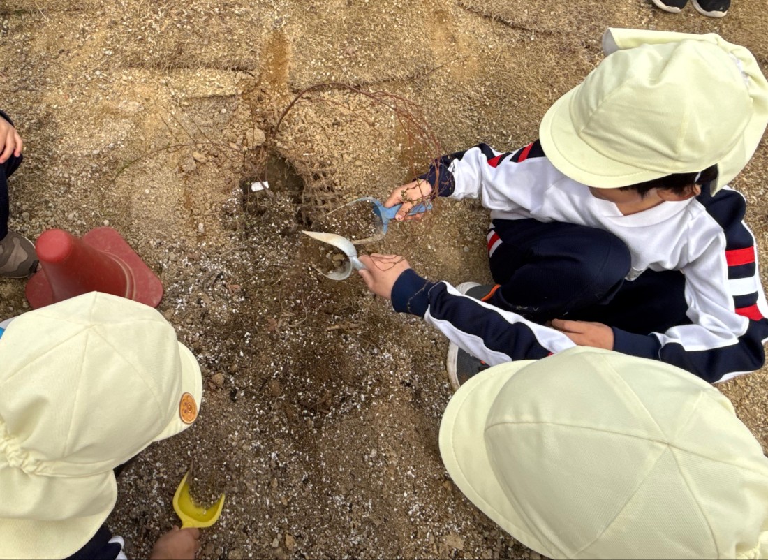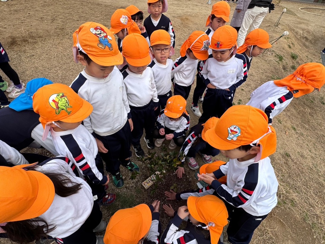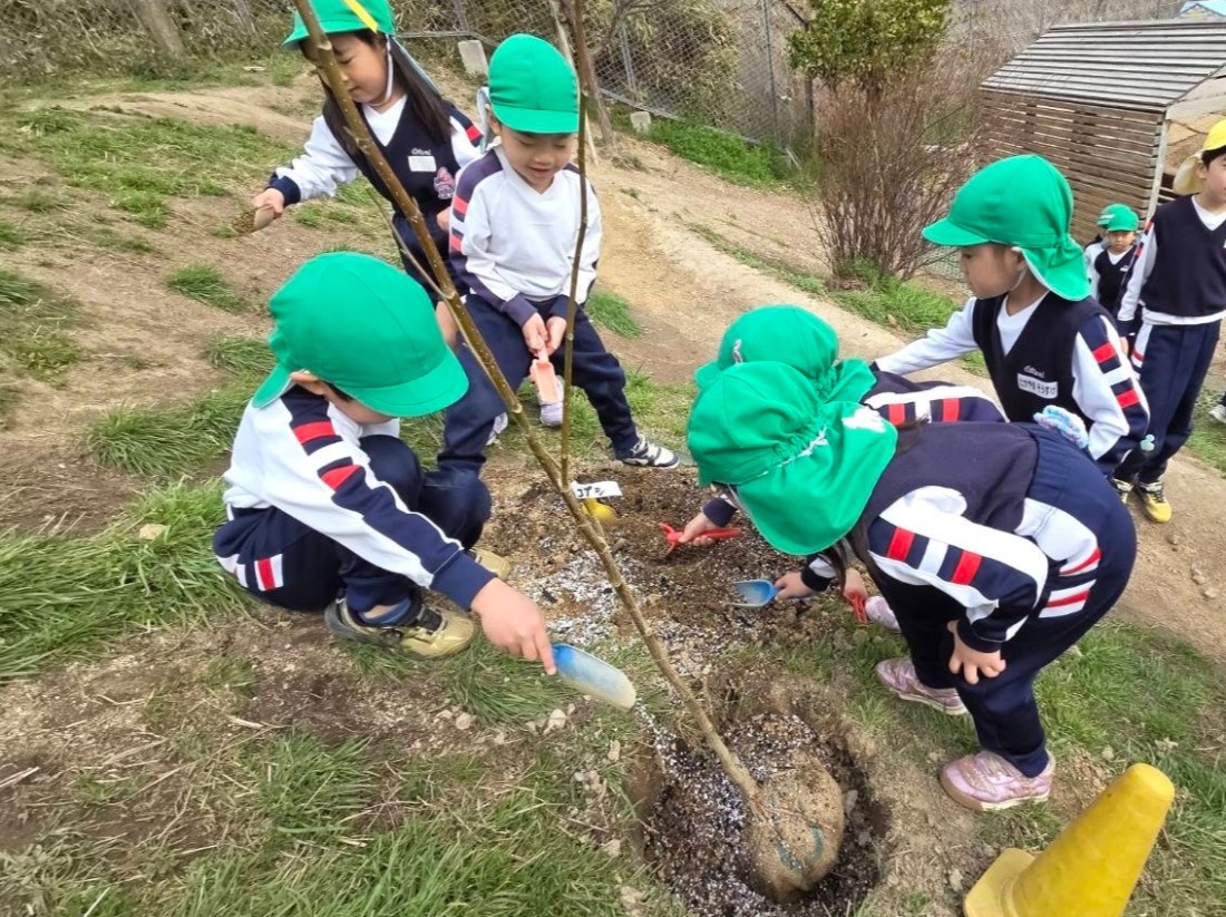 令和7年度、園庭改修工事の締めくくりとして第3園庭で「植樹祭」が行われました。