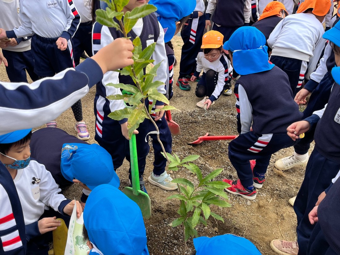 トンネルがついた大きな築山ができました。昨年は田んぼができました。広い道もできました。来年度は新しい畑もできます。そんなみんなが大好きな園庭に今日はたくさんの苗木を植えました。新たな生き物がやってくるでしょう。猛暑に少しでも木陰をもたらせてくれるでしょう。木々の成長を願いつつ子どもたちみんなで植樹祭を終えました。本日お越しいただいた皆様、ありがとうございました。