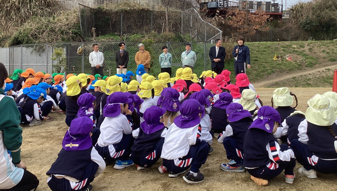 左藤章理事長先生、大阪狭山市役所公園緑地グループより2名、田んぼや築山つくりでお世話になっている瀬口さんや大阪大谷大学井上先生、バルーンでお世話になった近藤さん、そして後援会会長樫山さんにお越しいただきました。秋にボランティア活動でお手伝いいただいた保護者の方々も参加してくださいました。