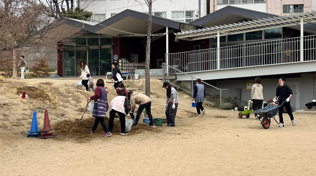 植樹後は遊戯室でお別れ会がありました。子どもたちが入室した後は、保護者の方々や後援会の方々で、植樹した苗木や築山の整備をしていただきました。