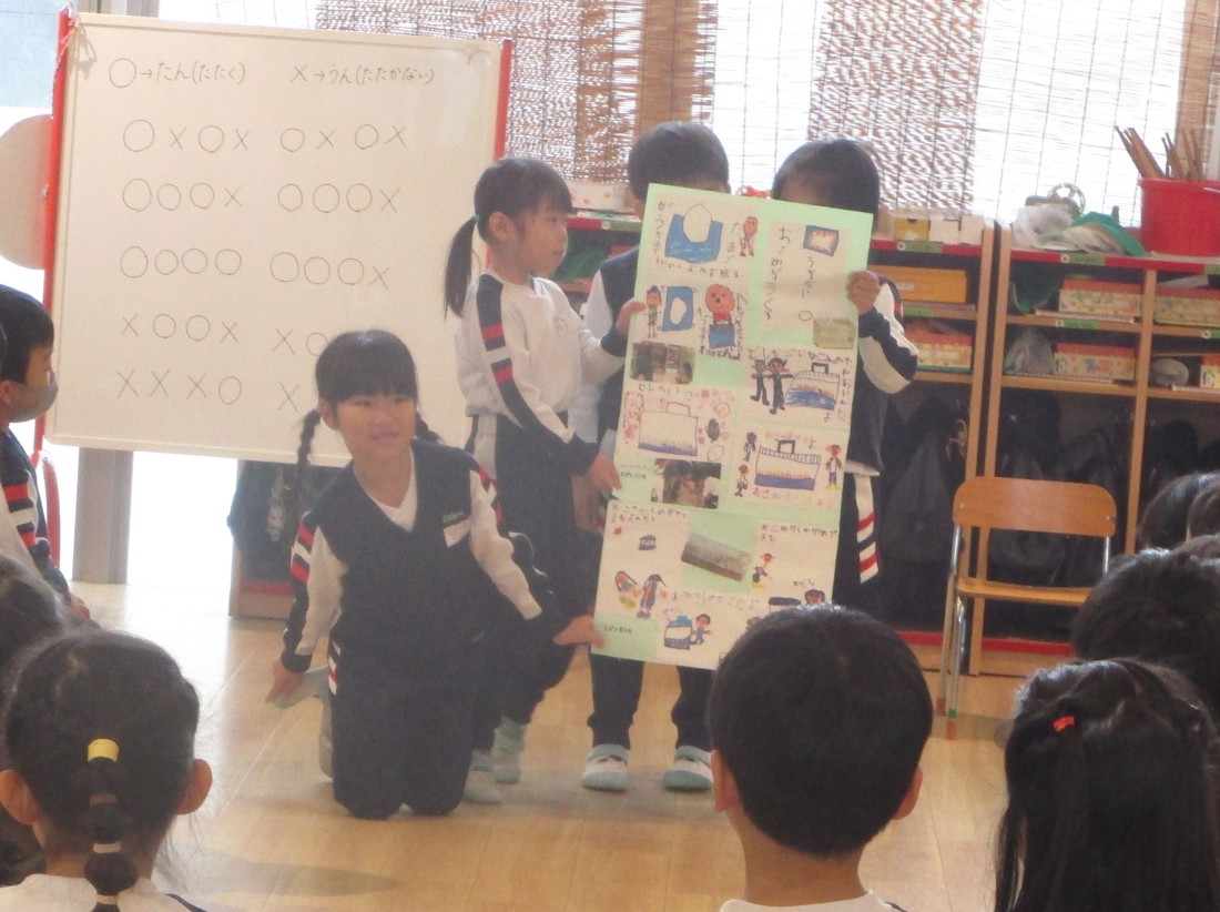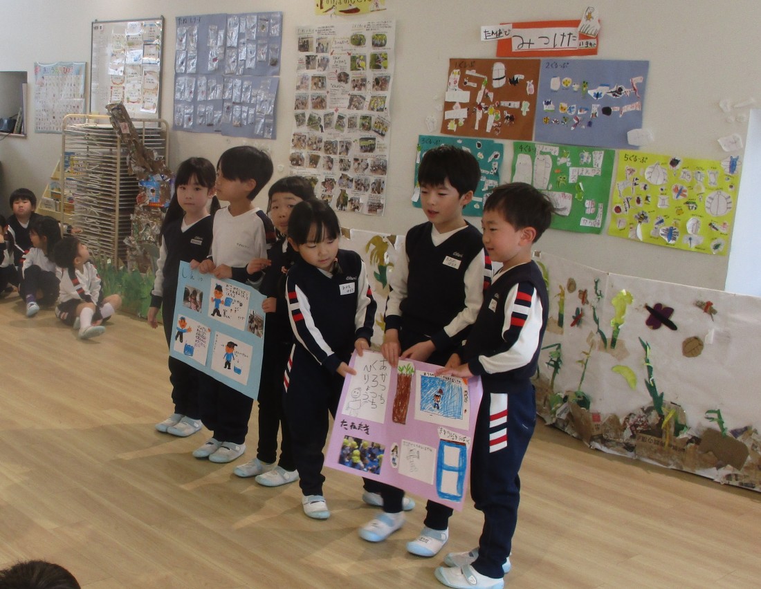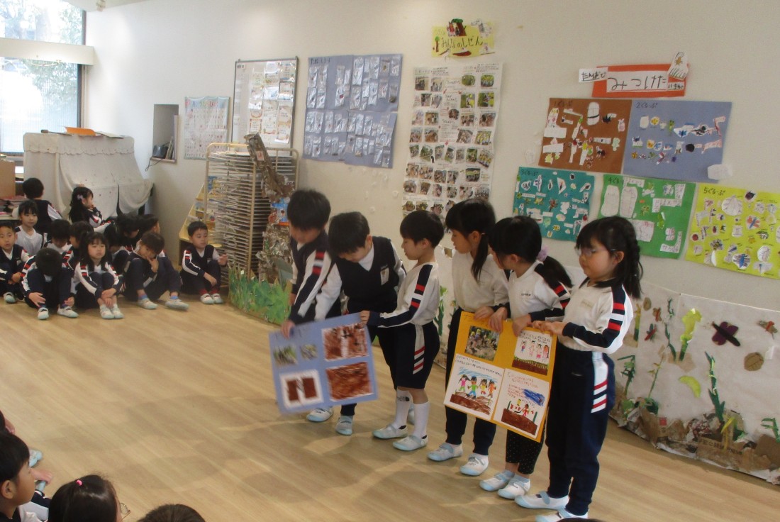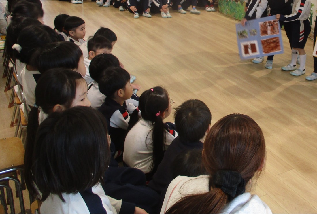 4歳児まつ組もみじ組は、5歳児の発表を一生懸命に聞いていました。