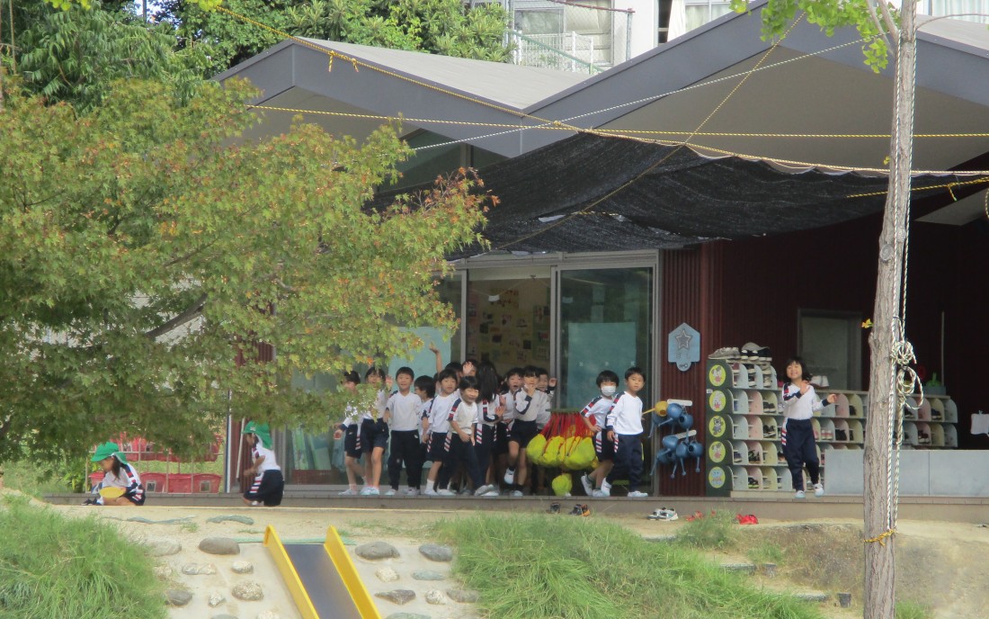 テラスをお散歩する0歳児もも組さん。5歳児ほし組のお兄ちゃんたちが遊ぶ様子を目で追い、と ...