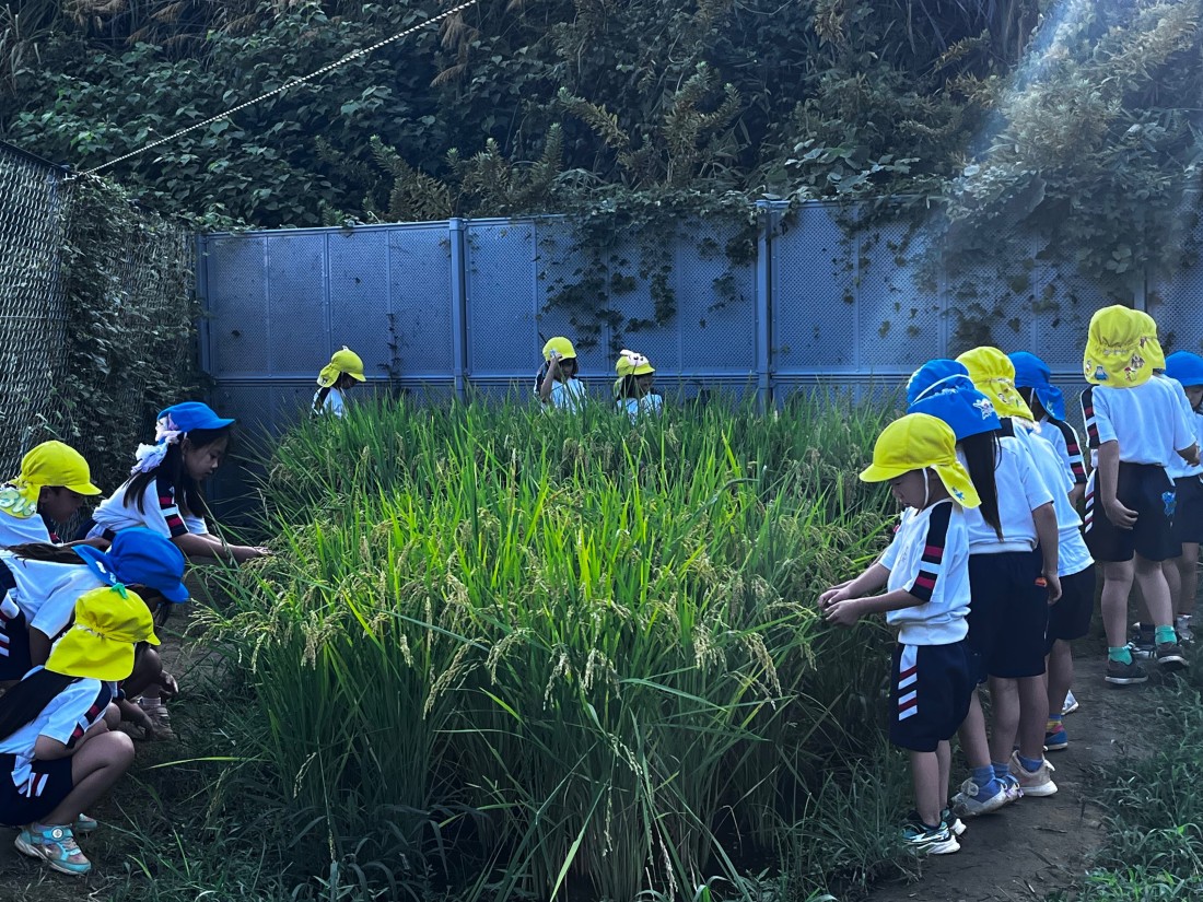 4歳児まつ組さん。自分のポケット図鑑をもって園庭に出ていました。草むらでは「大きなバッ ...