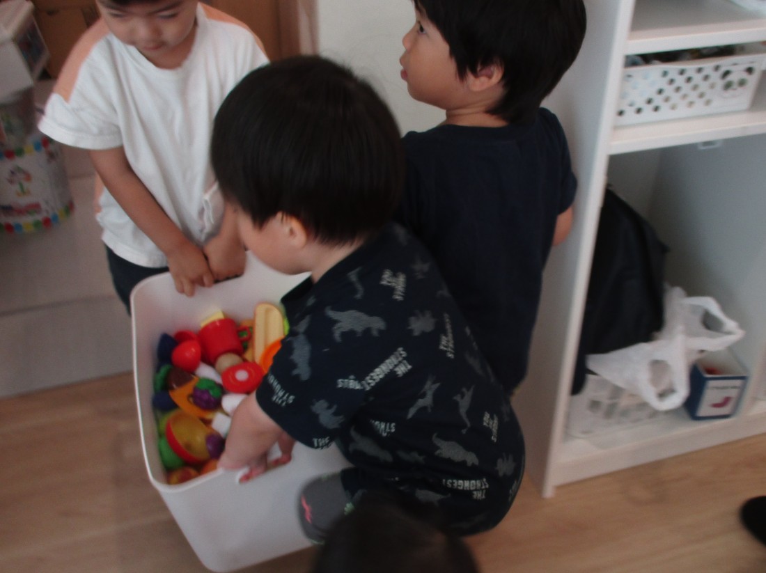 友だちと力を合わせておもちゃ箱も運んでいました。