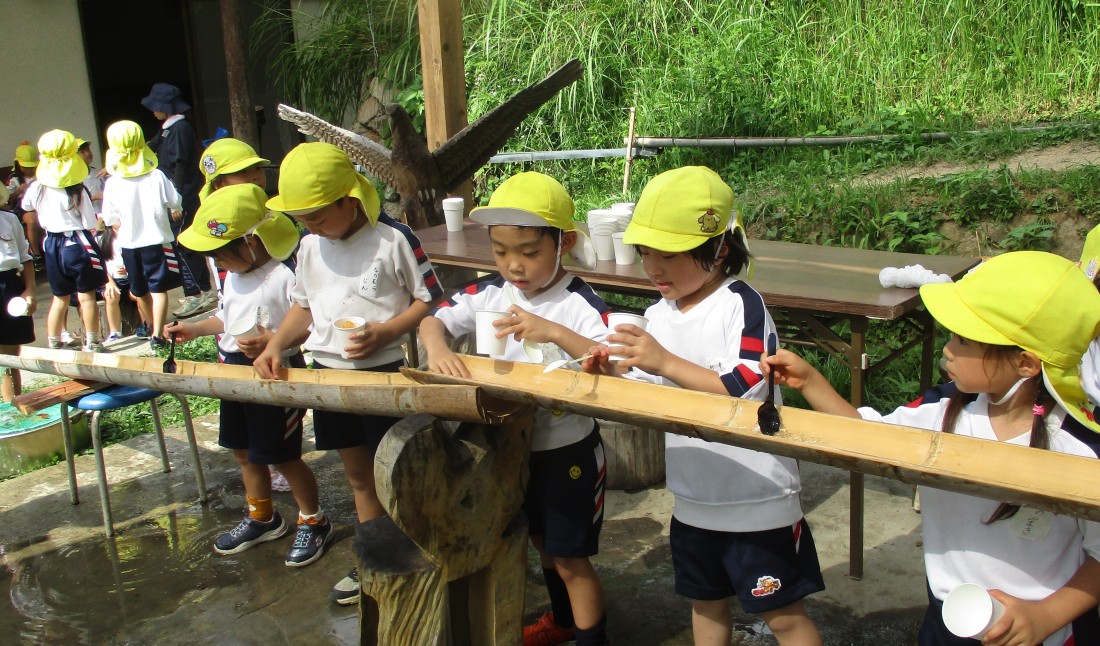 さぁ、森でいっぱい遊んで里に帰ります。最後に「ゼリー流し」を楽しみました。はるかさんの畑のプチトマトも流れてきました。すくったゼリーとプチトマトもとってもおいしかったです。