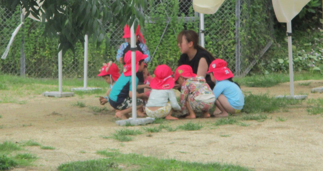 水遊び・どろんこ遊びが始まっています。乳児さんも道具を使って水を汲んだり移し替えたりして水遊びを楽しみました。
