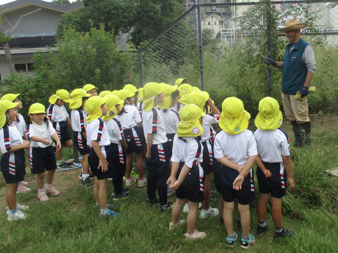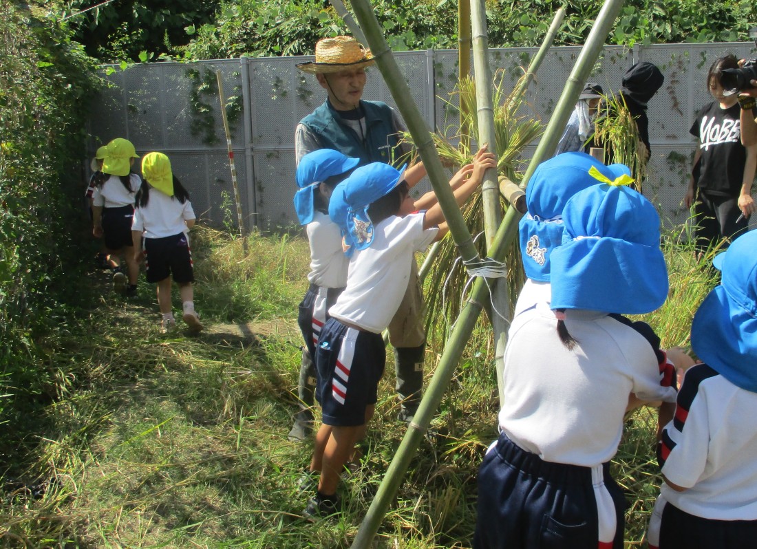 他学年が稲刈りの様子を見守っています。特に4歳児は「次に稲刈りするのは私達!」と興味津々な様子でした。
