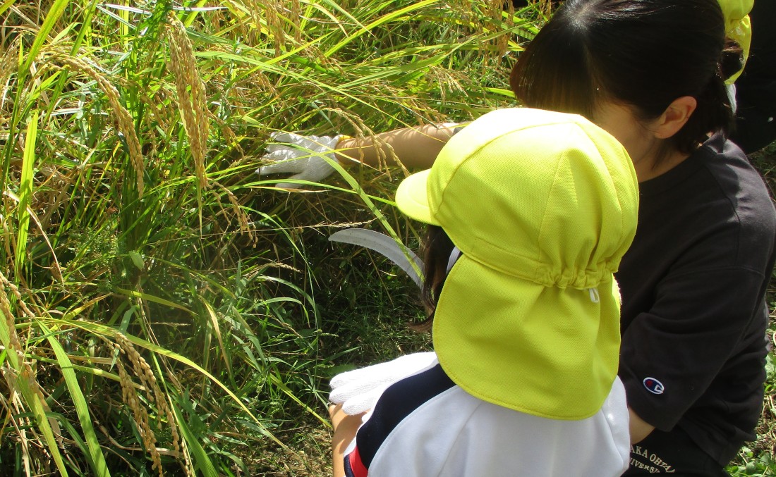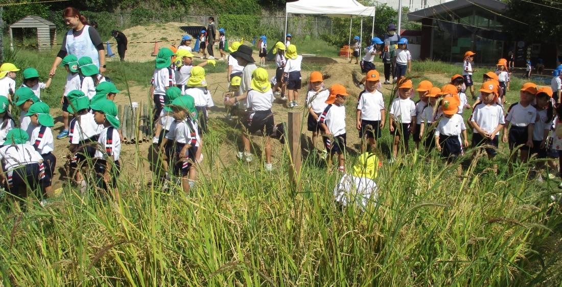 5歳児が、芽出し、田植えをして、ずっと育て見守ってきた田んぼの稲。とうとう稲刈りの日がきました。