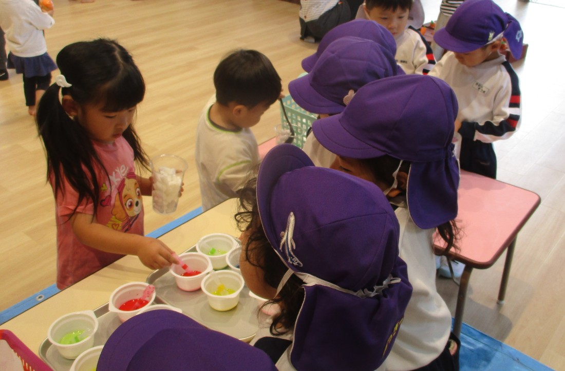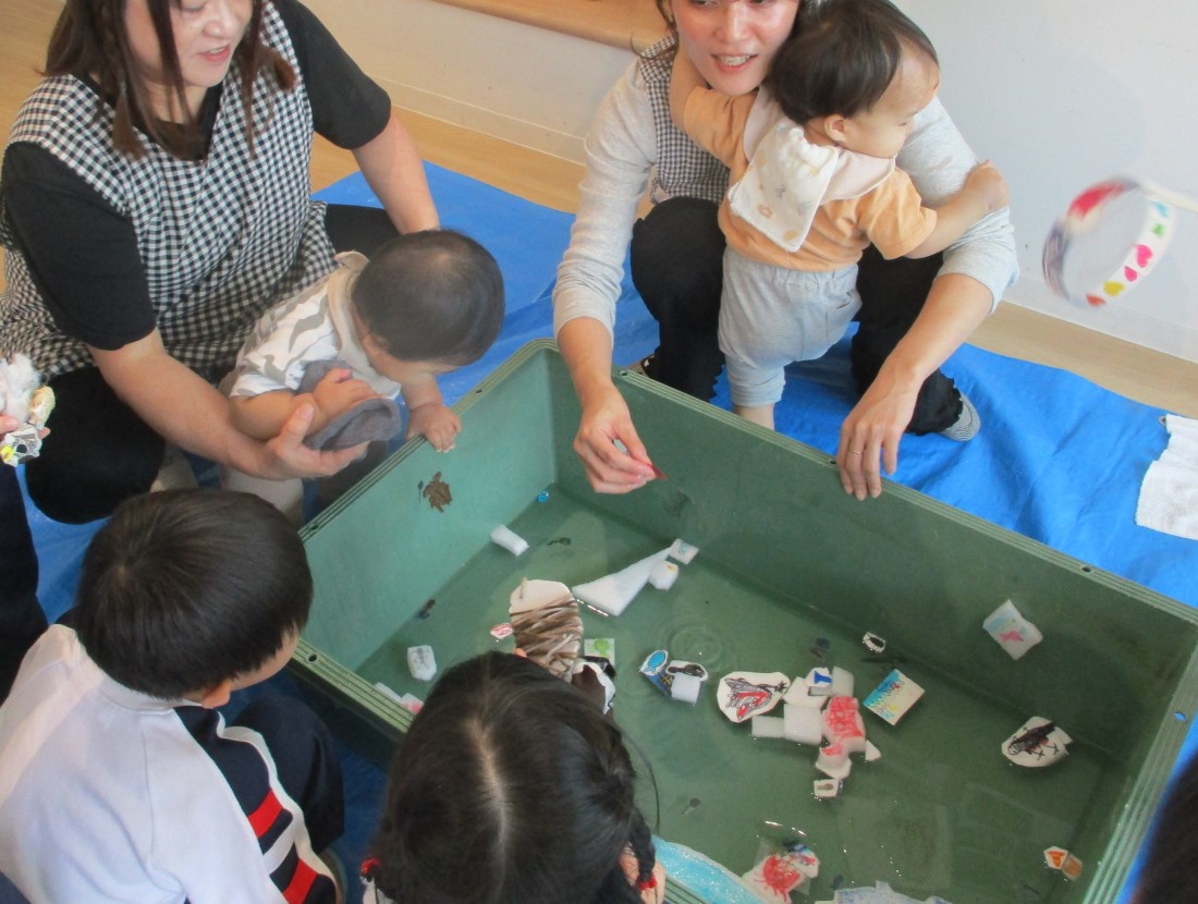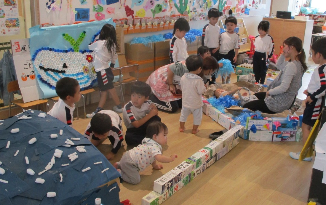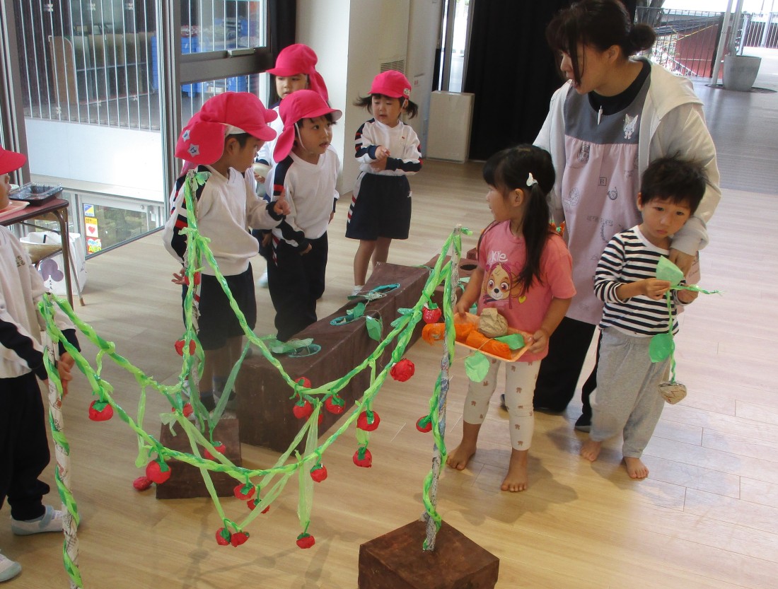 作品展に向けて各クラスのテーマでお部屋を設えてきた子どもたち。乳児さんに遊び方を伝えるのは少し恥ずかしそうでしたが、小さいお友達が遊んでる様子を見て嬉しそうにしていました。乳児さんたちは、先生と一緒に楽しそうに遊んでいました。明日は3歳4歳5歳での交流です。今日の経験を振り返り、明日にむけて子ども達と先生とで話し合っていました。明日の姿が楽しみです。
