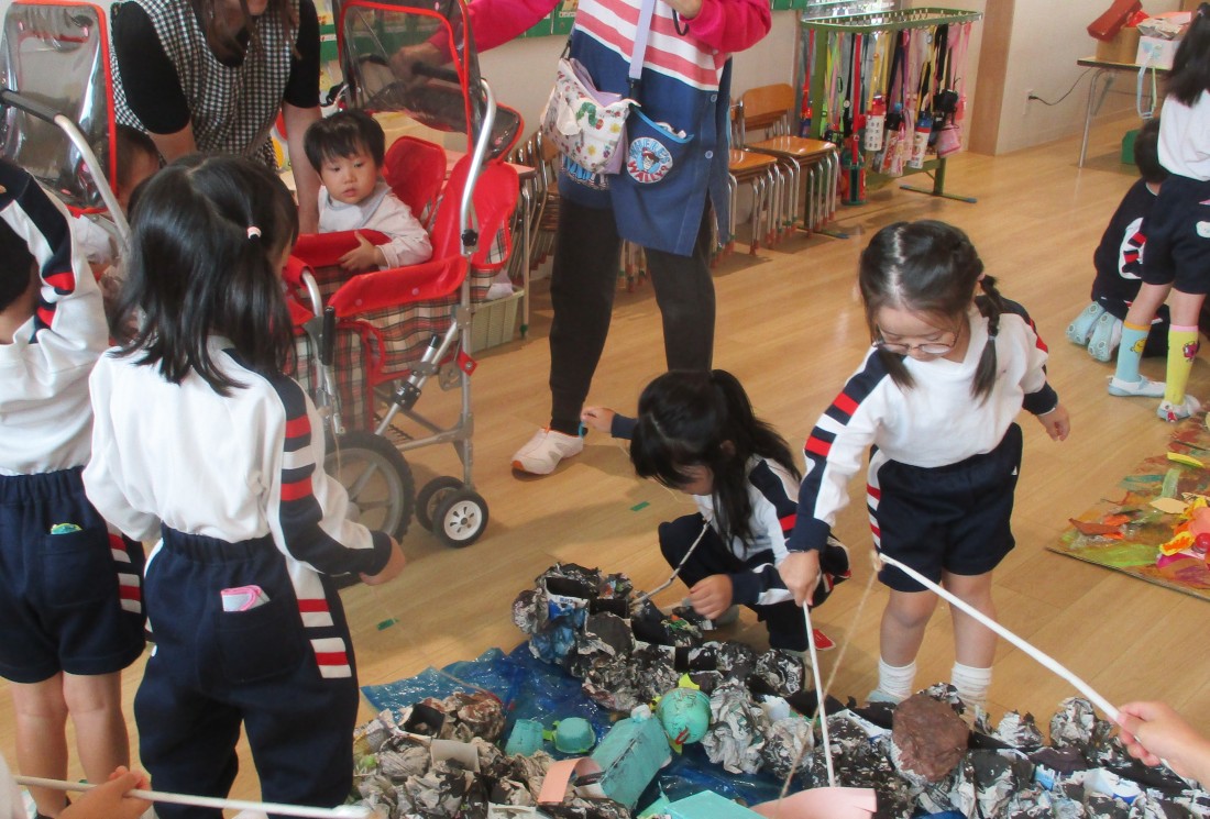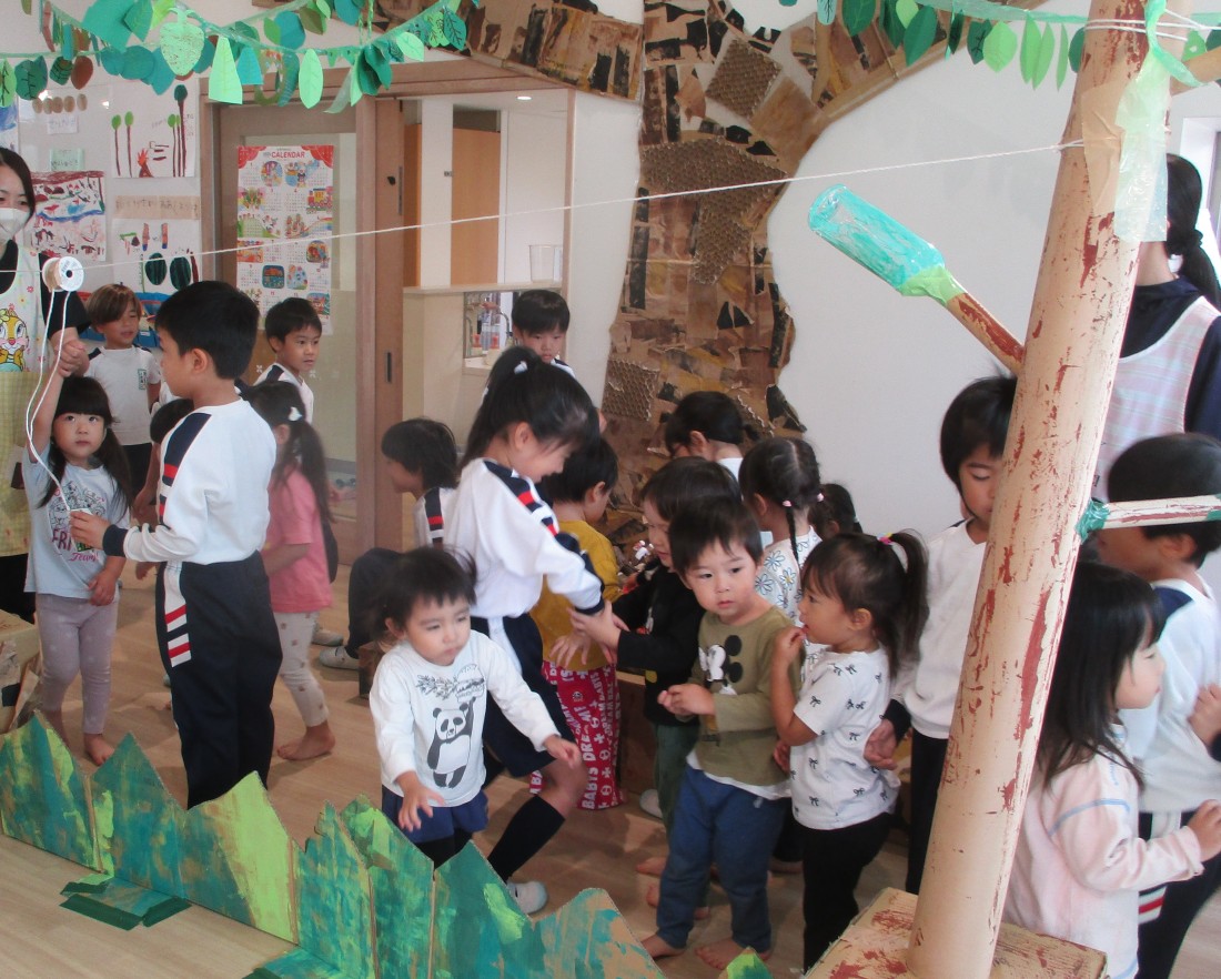 まだまだ完成途中ですが・・25日(土)の幼児の作品展に向けて、0歳1歳2歳の乳児クラスのみんなが遊びに来てくれました。