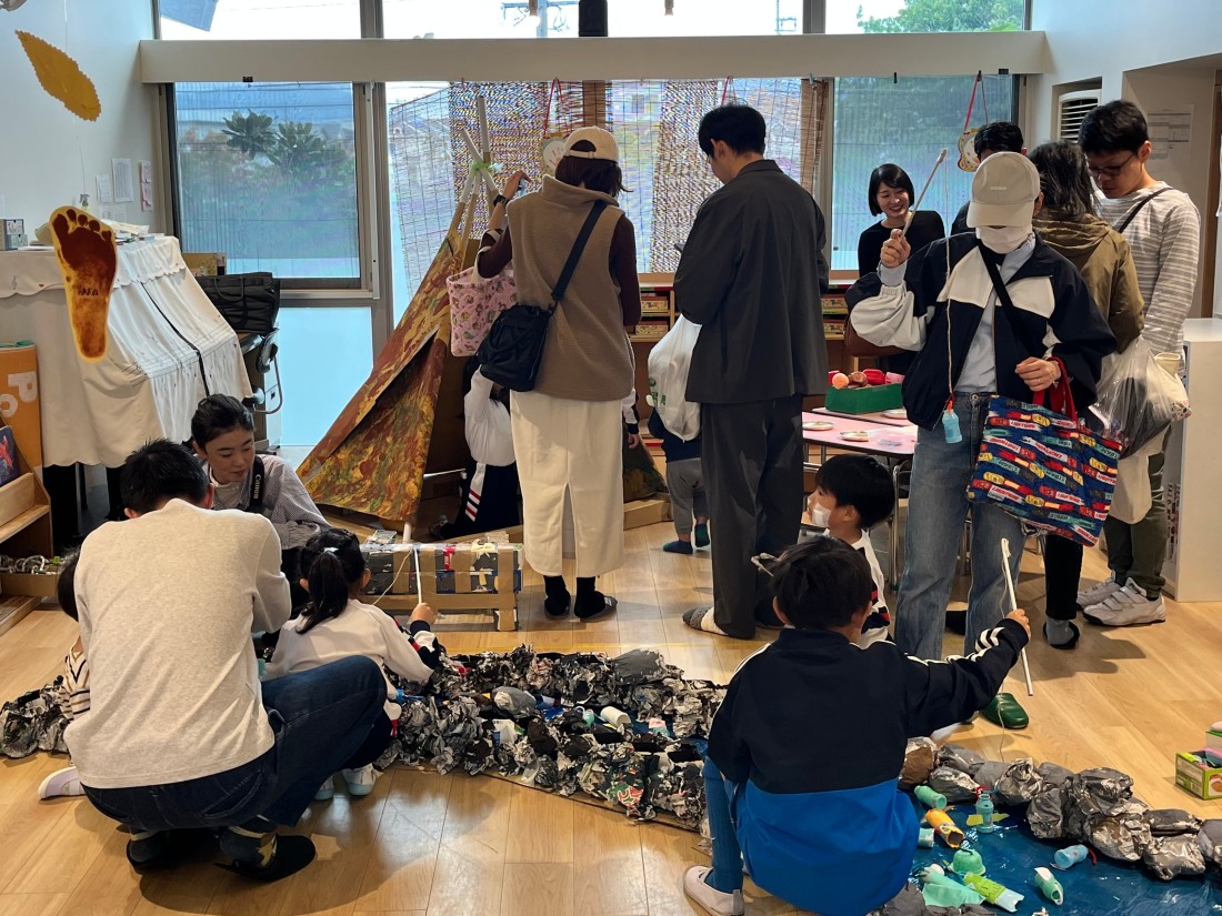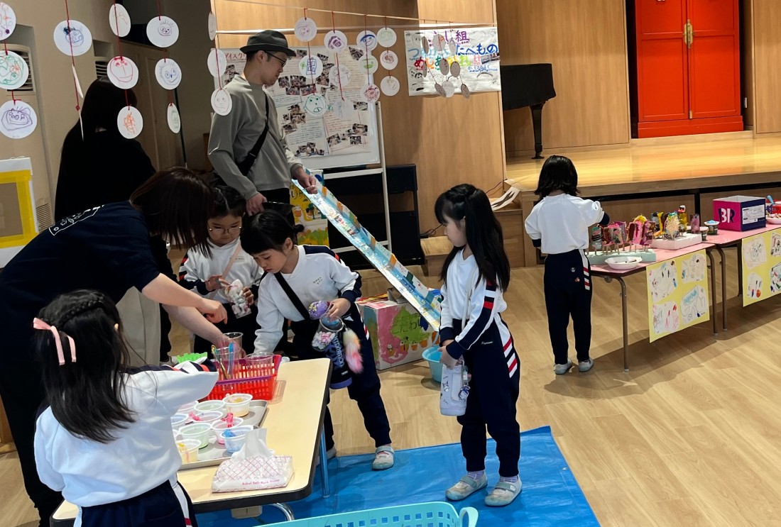 先週土曜日、幼児の作品展が行われました。今まで友達や先生と一緒にクラスのテーマに向かって遊んできましたが、今日はお家の人と一緒です。3歳児は3クラスが遊戯室。それぞれが遊んできたごっこの世界を持ち寄って楽しみました。