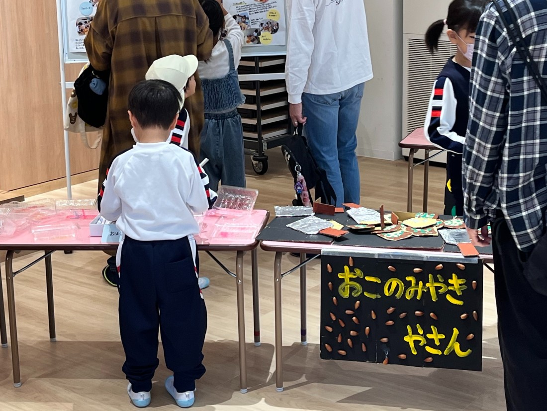 ゆり組は、「おいしい食べ物盛りだくさん」お好み焼きやさんお寿司やさん、リンゴあめやさんなど、たくさんの食べ物屋さんで遊びます。