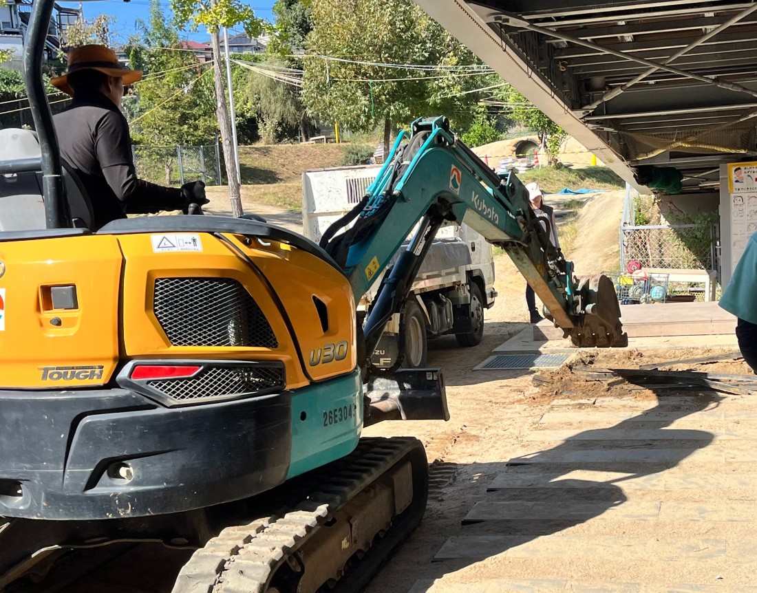 シャベルカーが、角がむき出しになって危険だった敷石を撤去します。