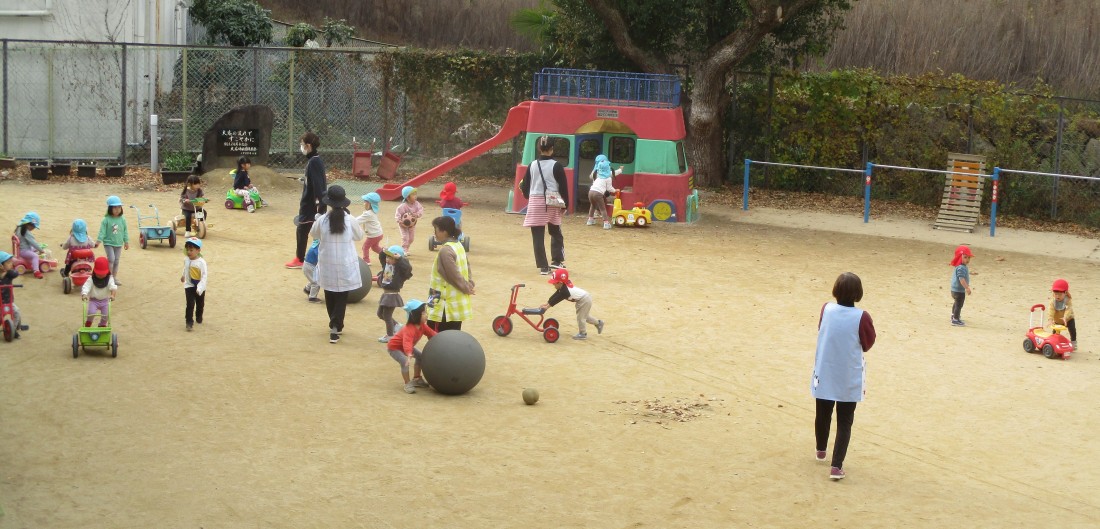 土曜日の参観・生活発表会でかわいい姿をいっぱい見せてくれた乳児さんたち。朝からお天気も良く、今日も園庭で先生や友達と一緒にたっぷり遊びました。