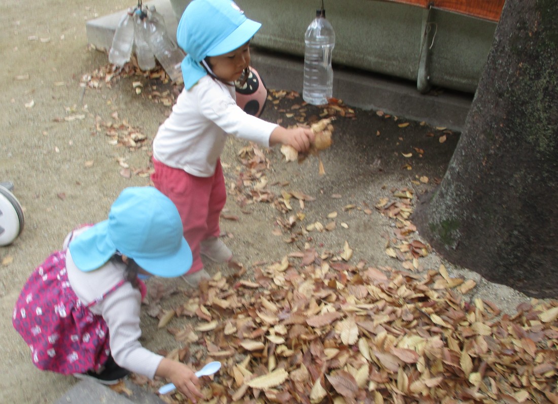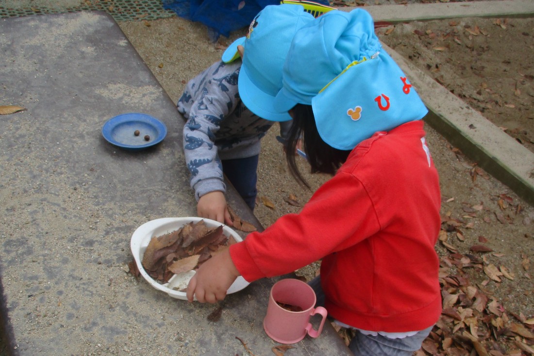 落ち葉が敷き詰められた保育室前の新しい乳児園庭では、落ち葉やどんぐりを食べ物に見立ててごっこ遊びを楽しんでいます。