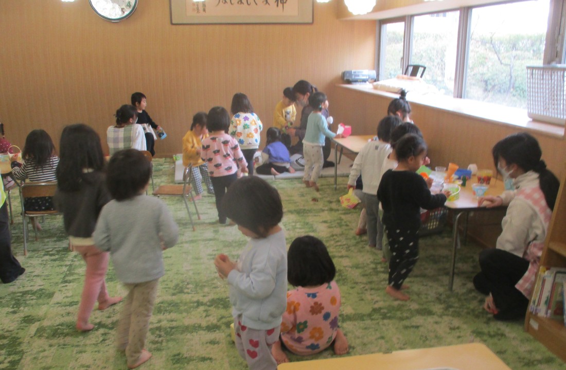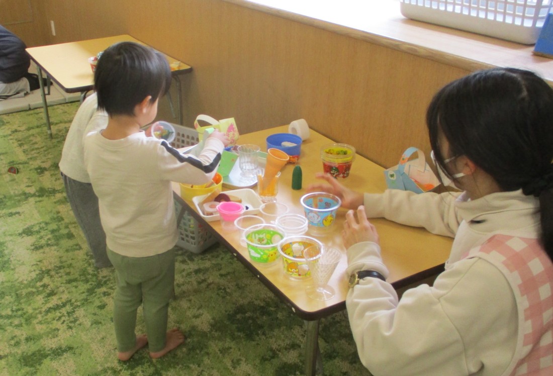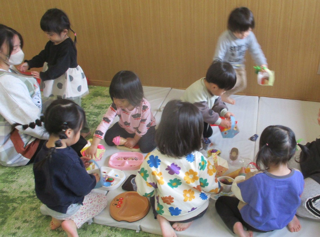 「おかえりなさい」「ただいま」「見て見て!おいしいパンが入っているよ!」・・友達や先生と言葉を交わしてごっこ遊びを楽しみました。