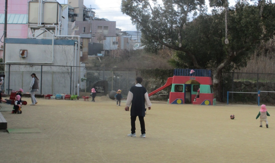 少々寒くても0歳児もも組さんたちが元気に園庭で遊んでいます。