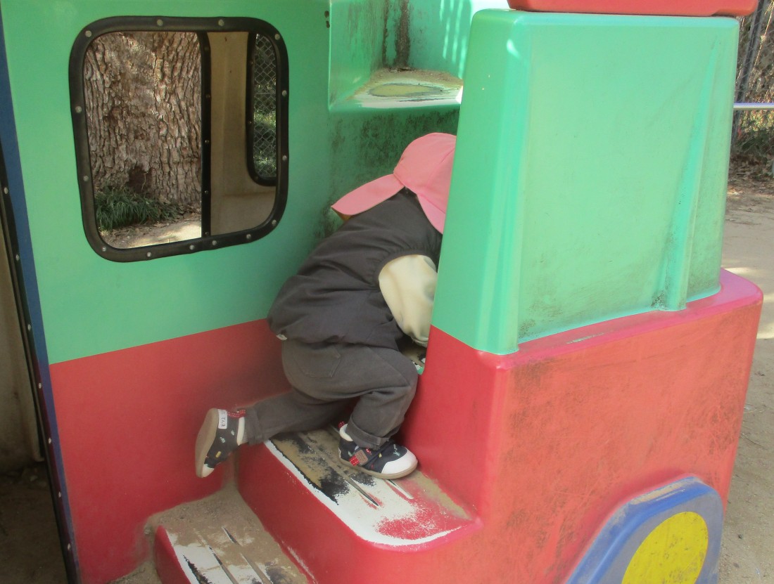 歩くことができるようになり、次は走ったり登ったり乗ったりすることが楽しくて仕方ないもも組さん。先生たちに見守られながらのびのびと遊んでいました。