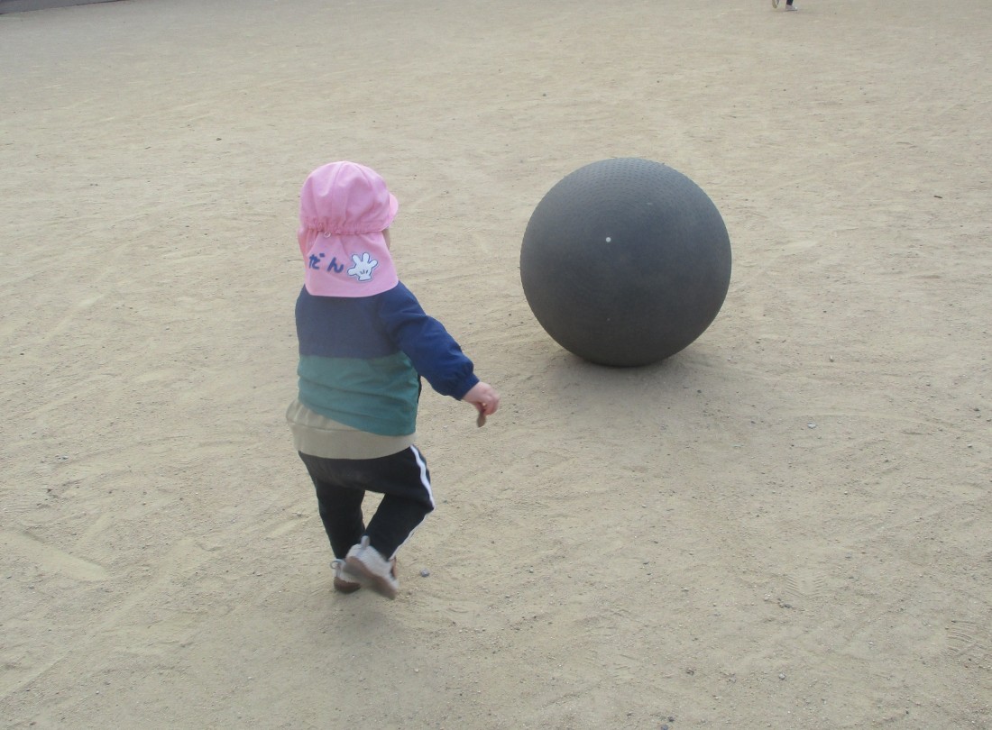転がる大きなボールを追って・・ボール待て待て!いつまでも追っていました。