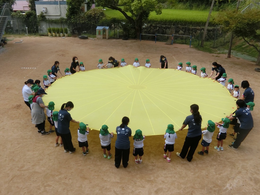 トンボが飛び交い、秋の訪れを感じる園庭で、学生さんたちと一緒に体を動かす楽しさを味わいました。