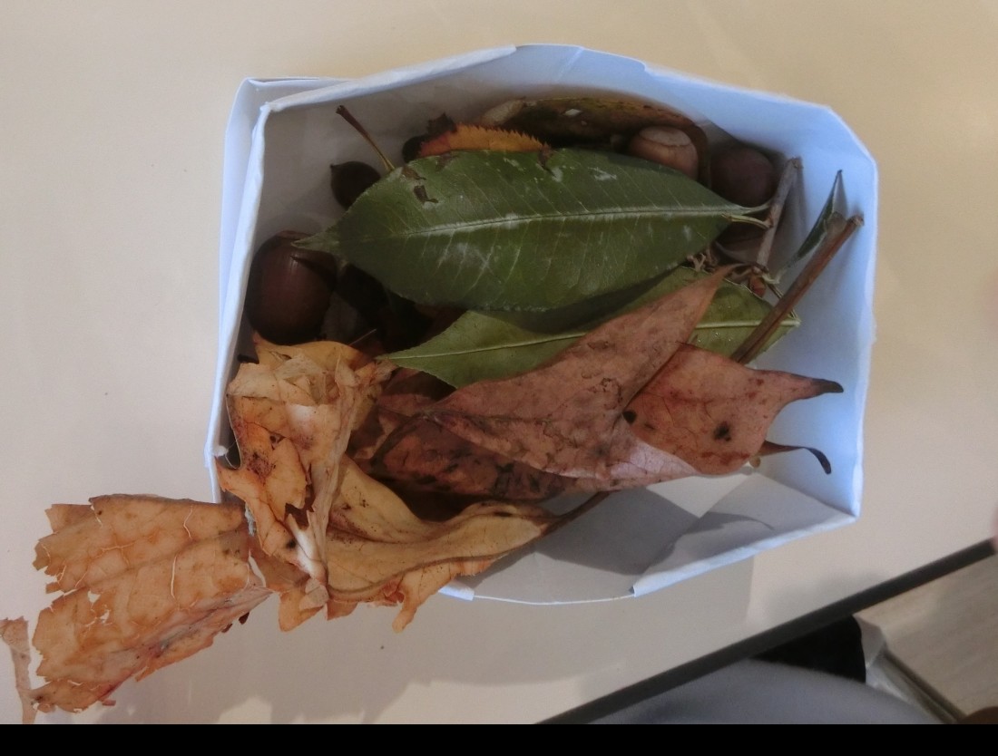 学生さんが作ってきてくれた”お弁当箱”に、子どもたちが集めた自然物と大学で集めた自然物をお弁当のおかずに見立て「これはソーセージだよ」「この葉っぱはホウレンソウ!」と話しながら詰めていました。