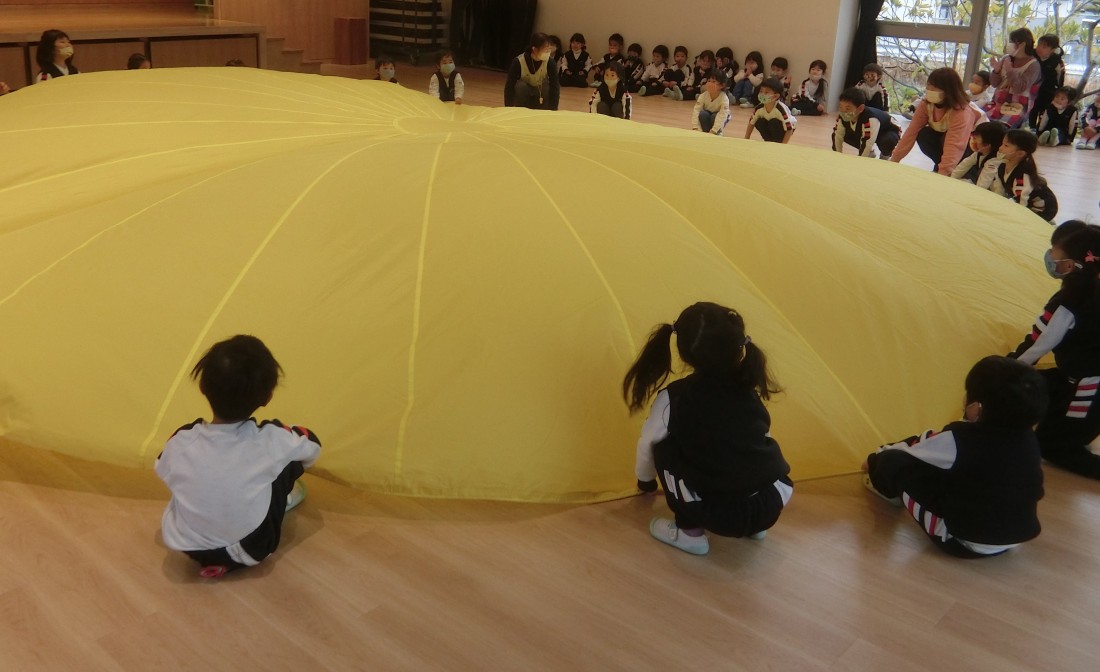 3歳児はみんなでパラバルーンで遊びました。お山を作ったり、ユラユラと揺らしたり、バルーンに入ったり。